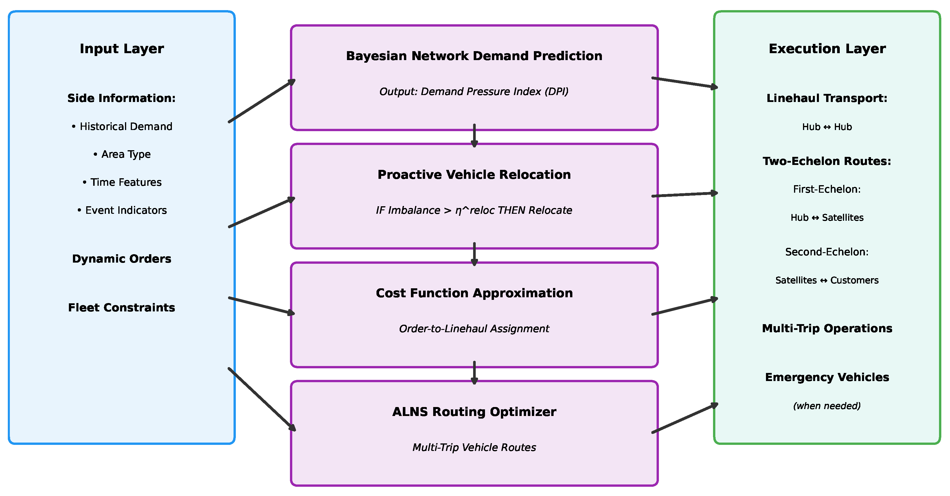 - Vehicle Dispatch and Routing: Selecting subset and determining multi-trip routes for available second-echelon vehicles, with binary variables indicating if route is executed.