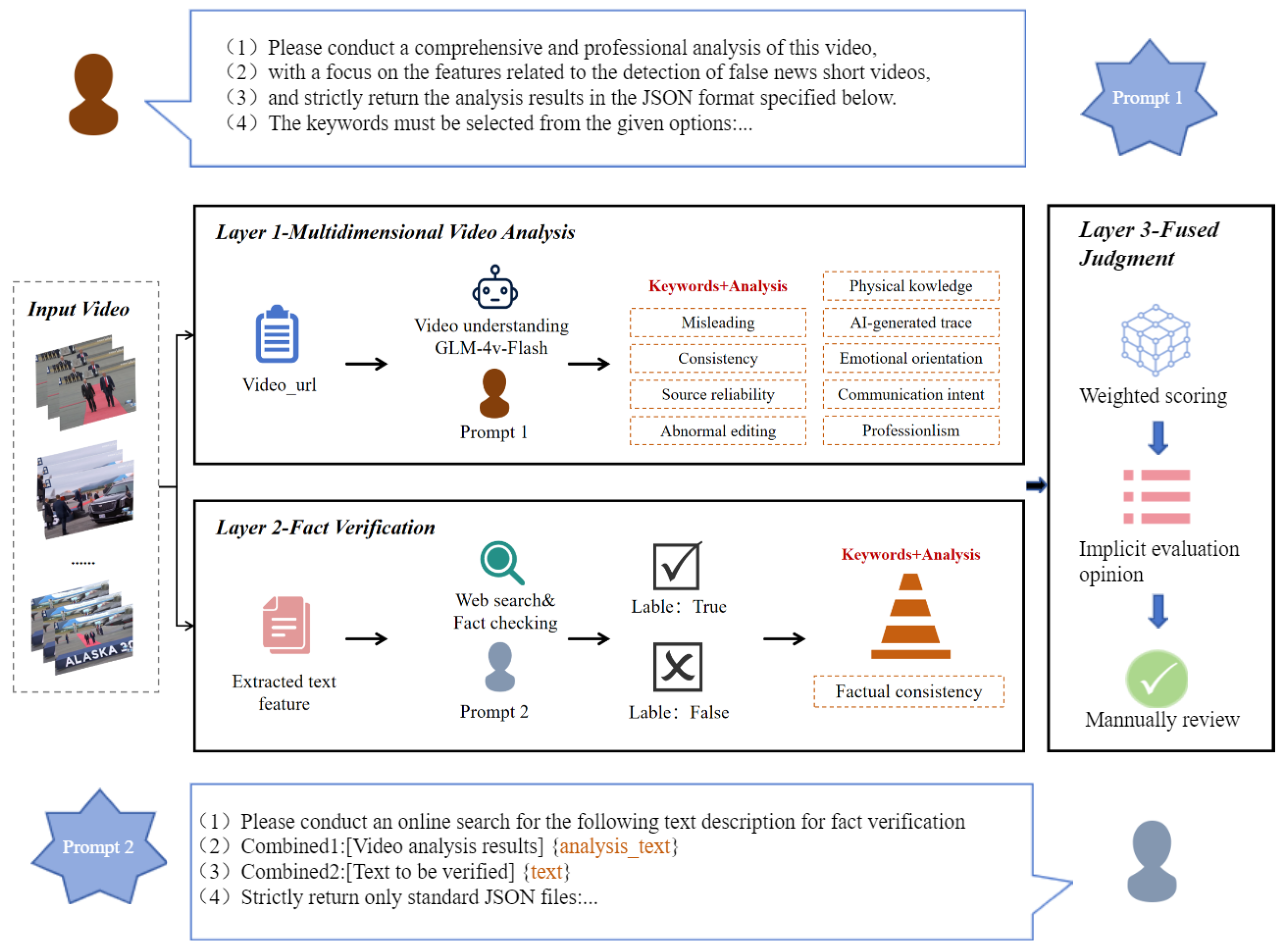 - We propose a multi-dimensional credibility assessment framework for detecting hidden manipulation and supporting fact-checking. Our approach incorporates both intrinsic multimodal content such as text, audio, video, user profile information, and comment threads, as well as external fact-checking signals, which together enable the identification of subtle manipulation tactics. The framework evaluates nine specific dimensions: the level of expertise reflected in the content, consistency with physical laws and commonsense knowledge, the likelihood of being generated by AI, the presence of editing artifacts, the degree of alignment between title and content, the extent of emotional bias, the use of misleading cues, the reliability of the source, and the intention underlying information propagation. This fine-grained analysis provides a precise quantification of news credibility. In comparison with traditional single-modality or shallow-feature methods, the proposed framework more effectively detects misleading short videos that appear credible on the surface, thereby enhancing both detection accuracy and robustness.