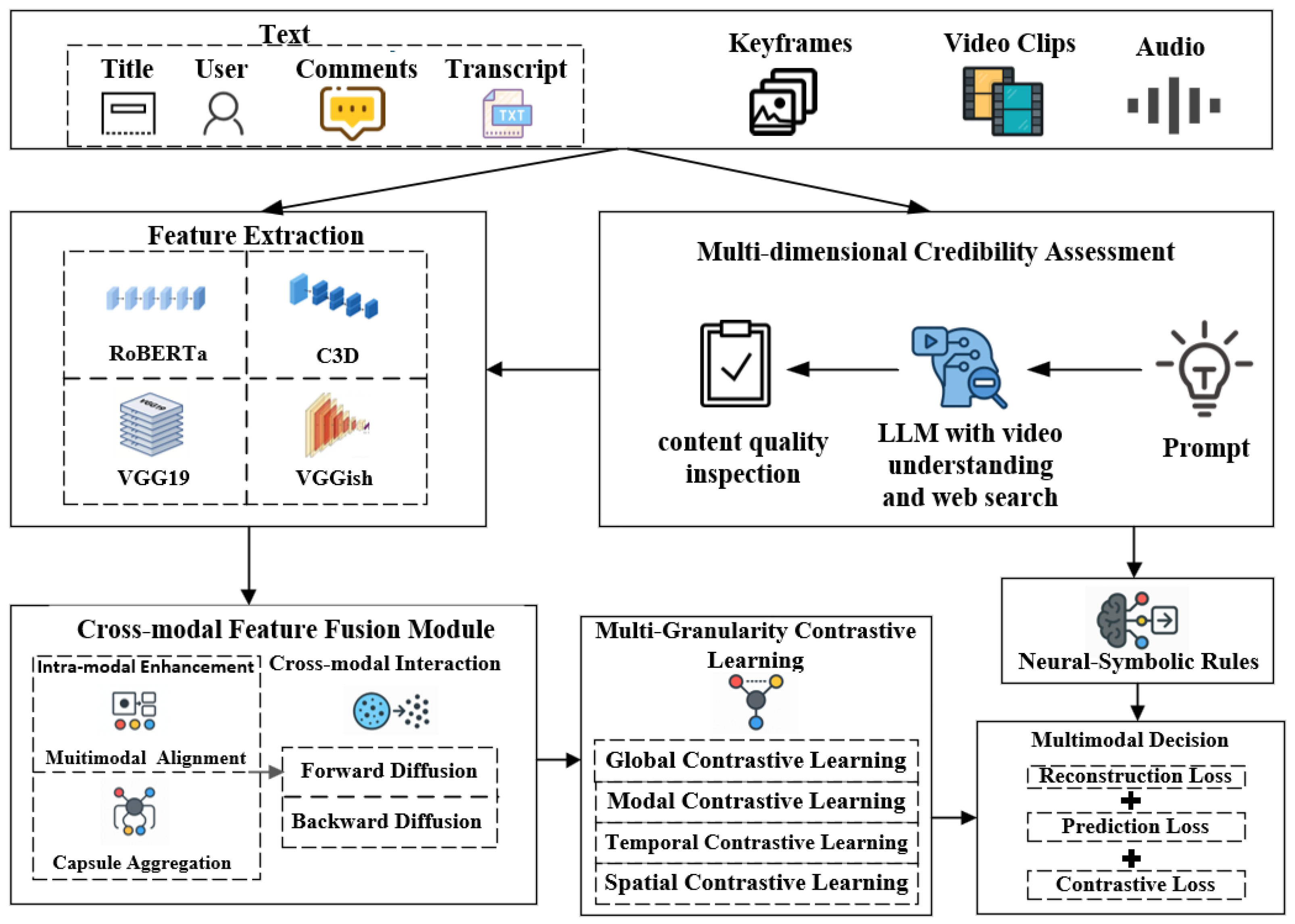 APA StyleYang, Y., Shi, X., Li, H., Fan, B., & Xu, Y. (2025). Fake News Detection in Short Videos by Integrating Semantic Credibility and Multi-Granularity Contrastive Learning. Applied Sciences, 15(23), 12621. https://doi.org/10.3390/app152312621