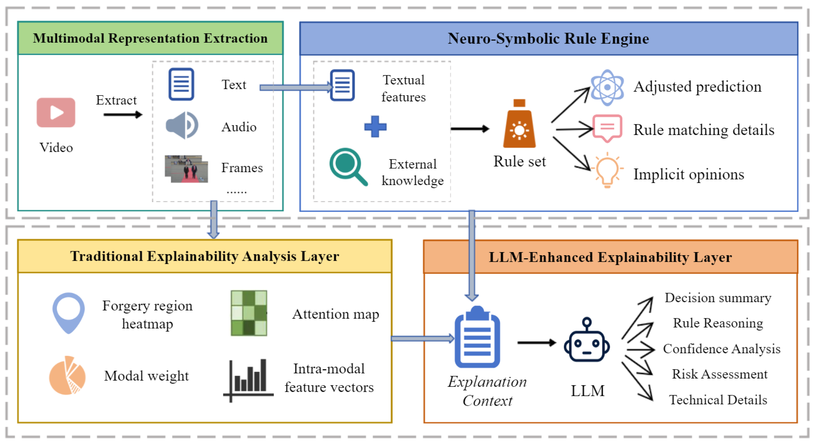 - We present an explainable detection framework for fake news in short videos. The neural-symbolic rule engine provides logical explanations for model decisions and outputs each video score on the credibility assessment dimensions along with the rule matching status. By combining this engine with the multimodal feature fusion module, we achieve traceable decision-making, enhancing system transparency and trustworthiness.