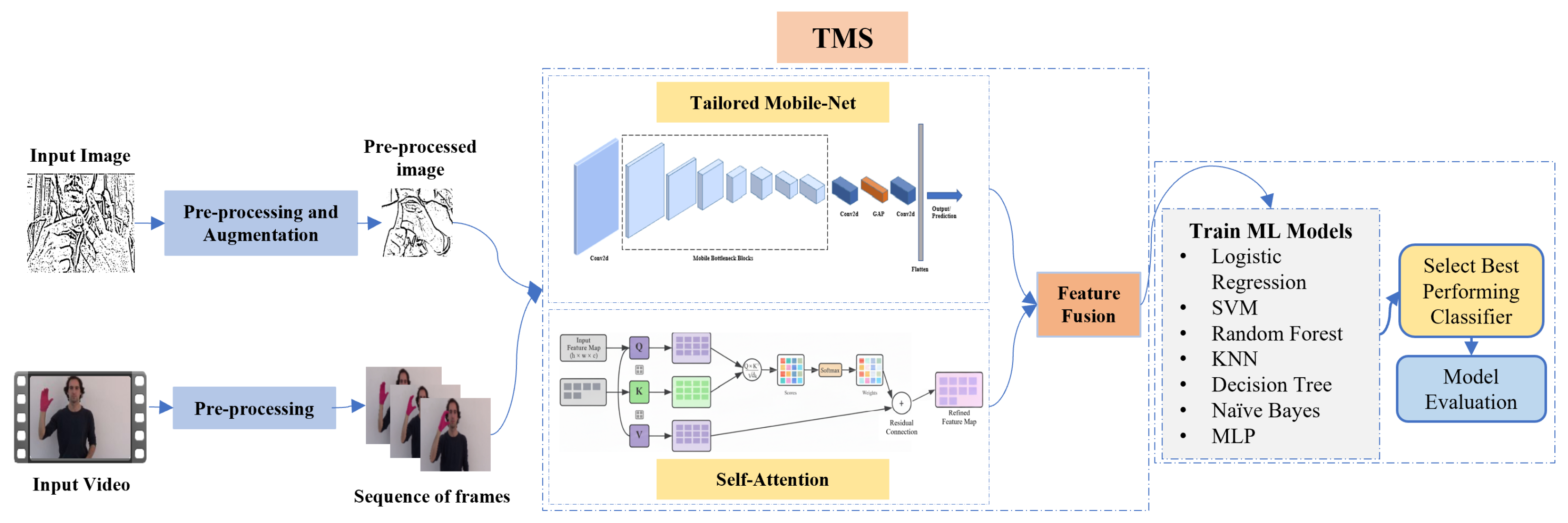 - Lightweight Framework (TMS): We propose the ‘Tailored MobileNet with Self-Attention’ (TMS) framework, specifically designed to tackle the problem of efficient SLR on resource-constrained mobile devices. TMS integrates a MobileNet backbone with a Self-Attention module, which efficiently captures spatial and contextual features while minimizing computational overhead. This makes the framework suitable for real-world SLR applications where model size and inference speed are critical.