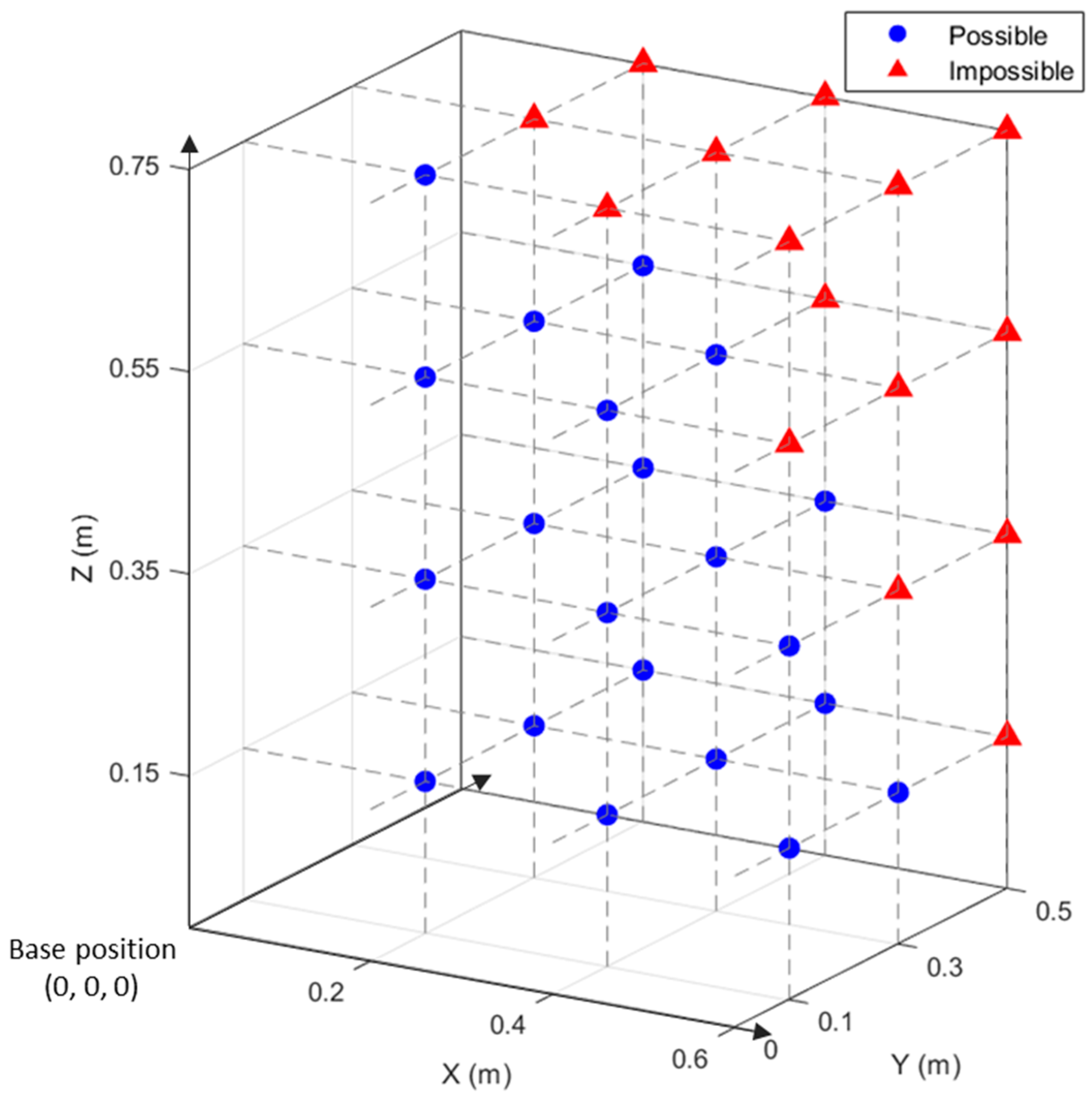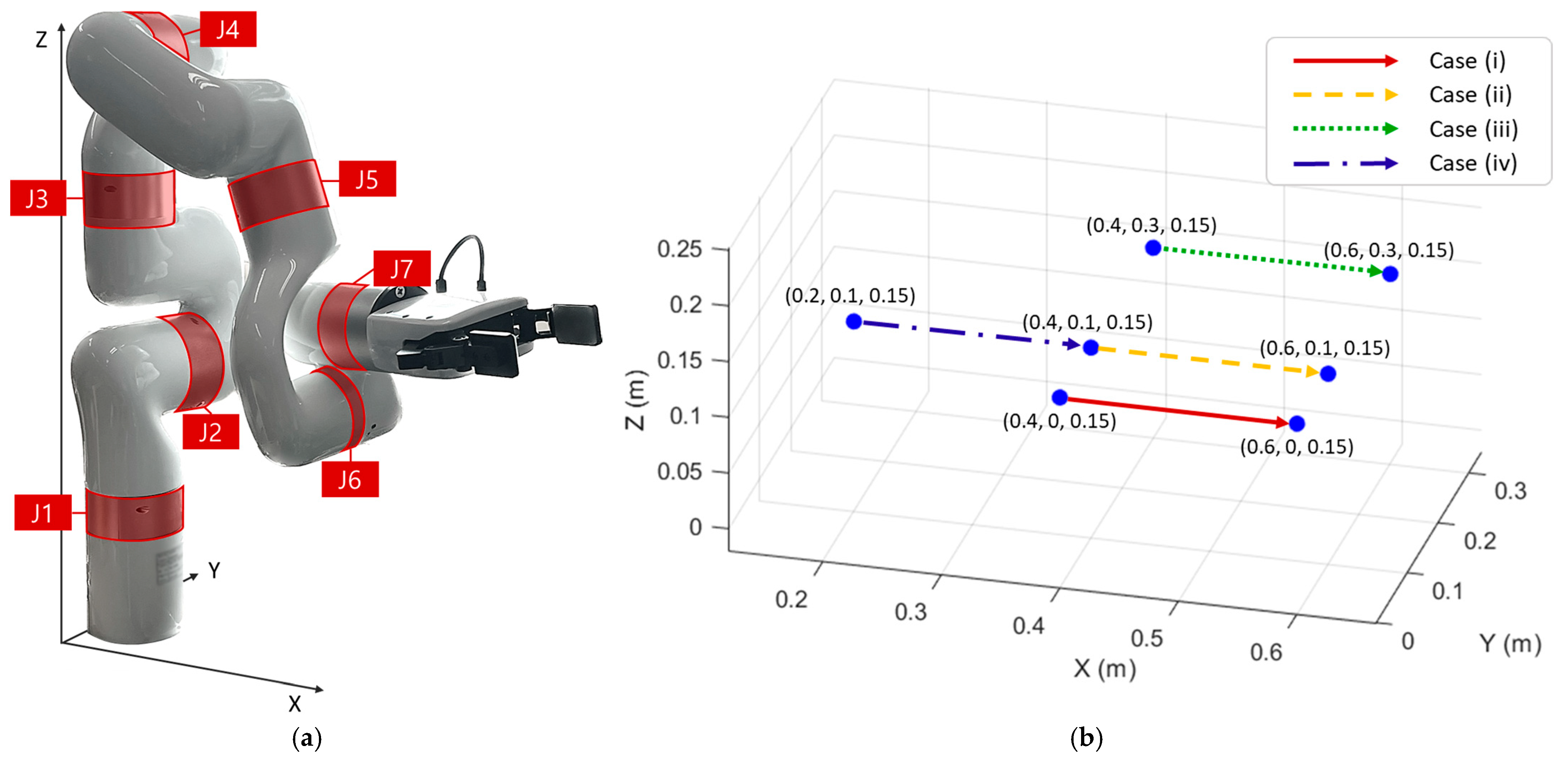 Table 15 presents the joint angles at the start and end of four movement cases, along with their differences. The comparison of Cases (i), (ii), and (iii) shows that larger Y-coordinate values lead to greater changes in the joint angles. Specifically, the average differences across the seven joints are 13.76, 15.31, and 18.20, respectively. In particular, for J1, J3, J5, and J7, no movement occurs when the Y-coordinate is zero under single-axis motion along the X-direction (Case (i)). In contrast, the comparison of Cases (ii) and (iv) shows that the increase in the X-coordinate does not result in significant differences in joint movement (15.24 and 15.31). These observations indicate that, for the RA employed in this experiment, the Y-coordinate (i.e., lateral displacement from the center) has a stronger influence on joint angle change than the X-coordinate (i.e., forward-backward displacement). Additionally, the SVM model (training data 60%) effectively captures this property from the data, as reflected by the higher importance of Y