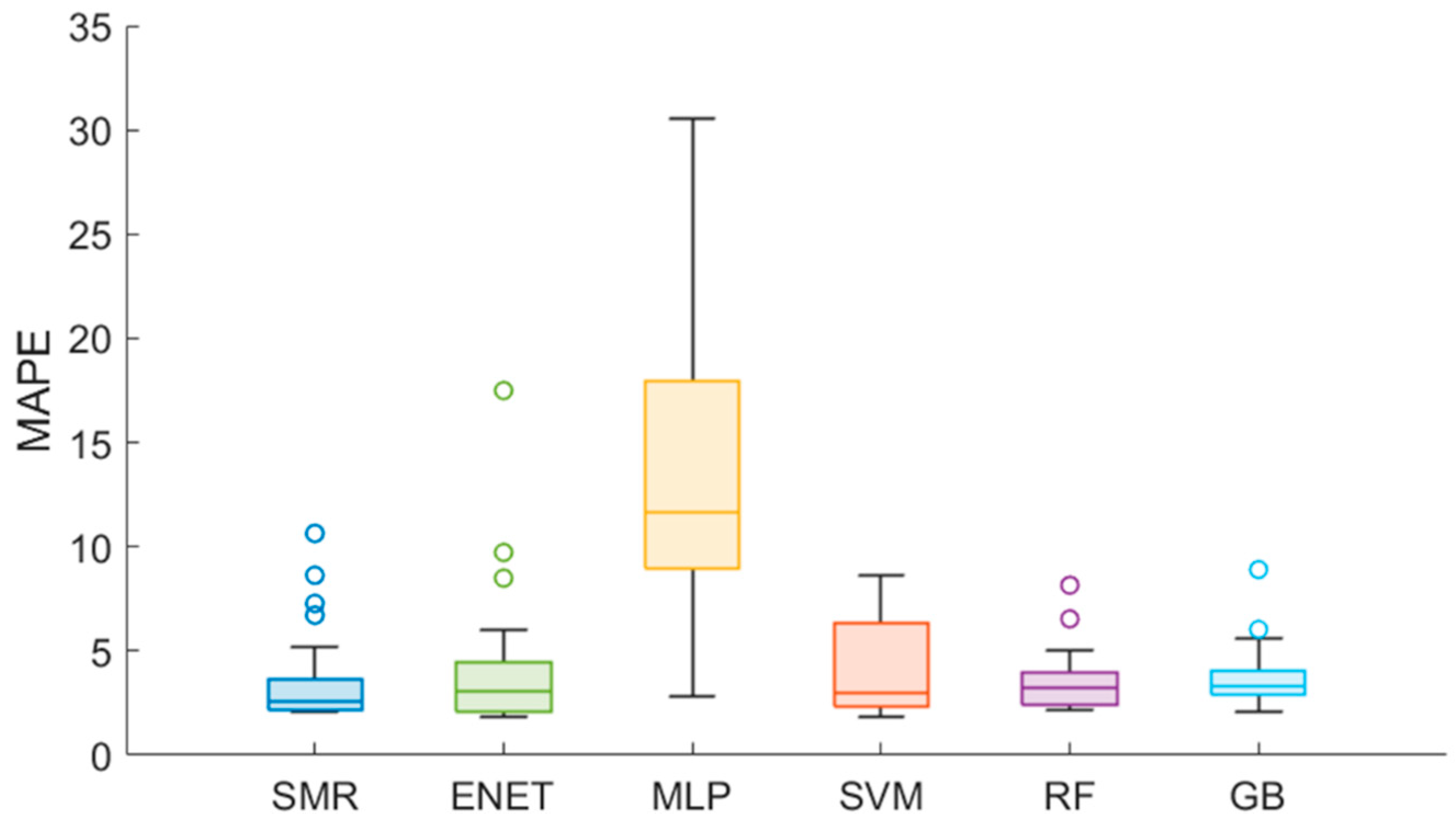 Figure 3. The ranking of model types by mean MAPE, from lowest to highest, is RF, SMR, GB, SVM, ENET, and MLP. In particular, MLP performs significantly worse compared to the other model types.