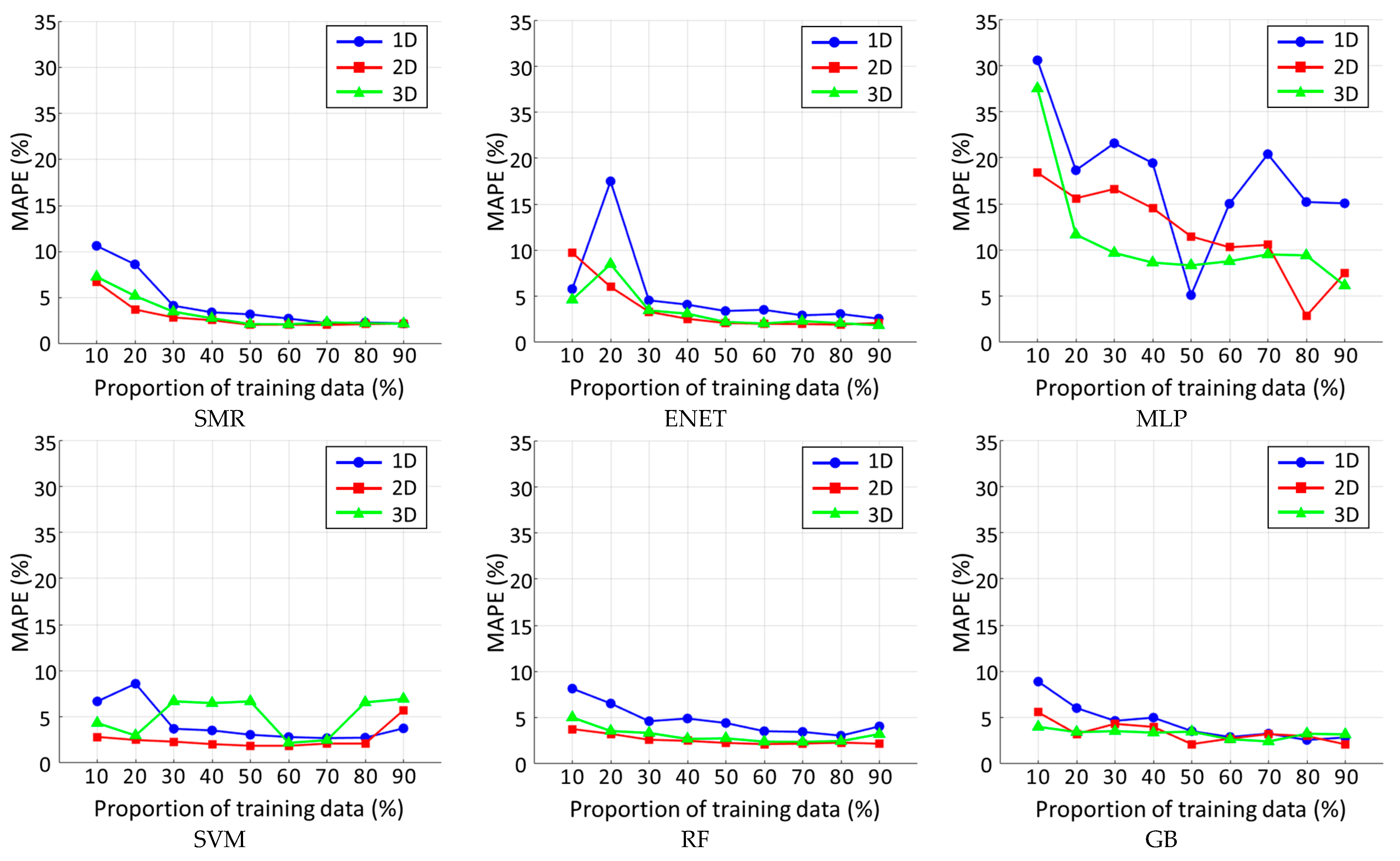 Figure 4 shows charts of MAPE for each movement type and the proportion of training data, categorized by six model types. In most cases, a higher proportion of training data tends to lead to improved prediction performance. However, in certain cases (e.g., 1D movement of SVM, RF, and GB, 2D movement of ENET, MLP, and SVM, and 3D movement of SVM and RF), MAPE increases when the proportion of training data reaches 90%. This phenomenon provides the insight that an increase in the amount of training data does not necessarily lead to improved prediction performance. Moreover, the variation in MAPE by various proportions of training data can serve as a basis for optimizing the cost and effort of data collection in practical applications. In addition, six model types show a common trend; MAPE for 1D movement is typically higher than those for 2D and 3D movements.