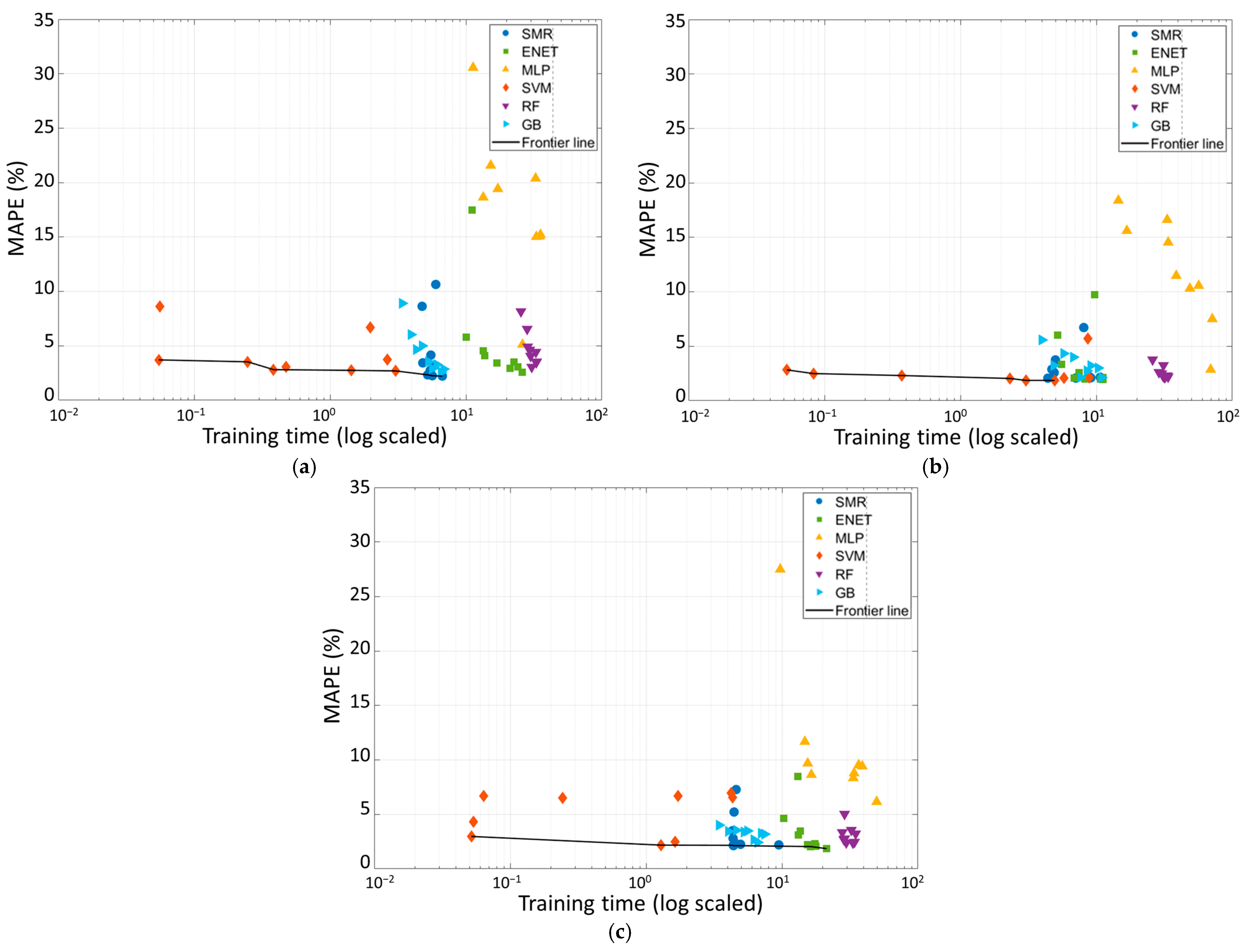 Figure 5a–c display MAPE versus training time for all 54 RA power prediction models for 1D, 2D, and 3D movement, respectively. Each prediction model is displayed with a different marker according to model type, and the Pareto frontier is drawn as a black, solid line.