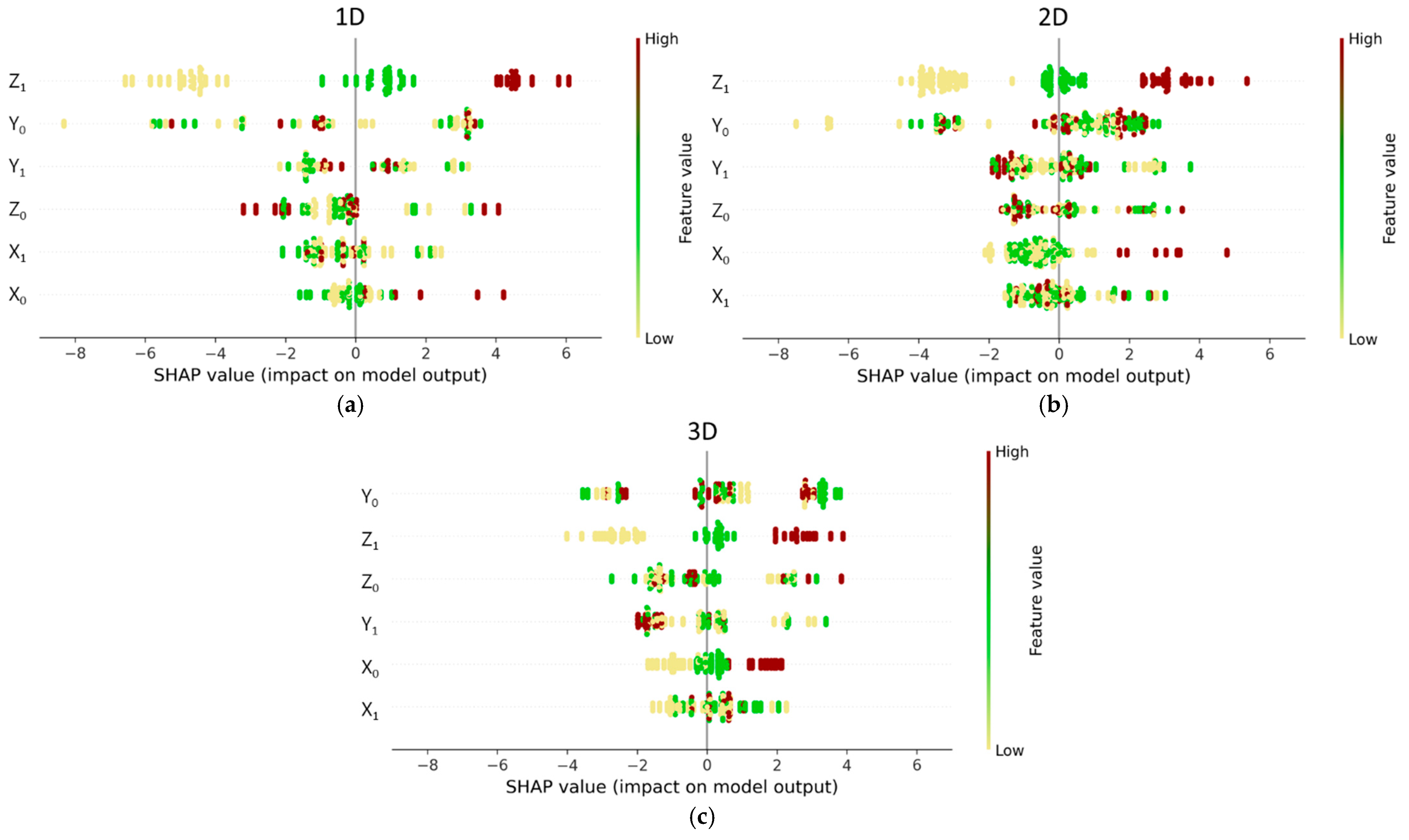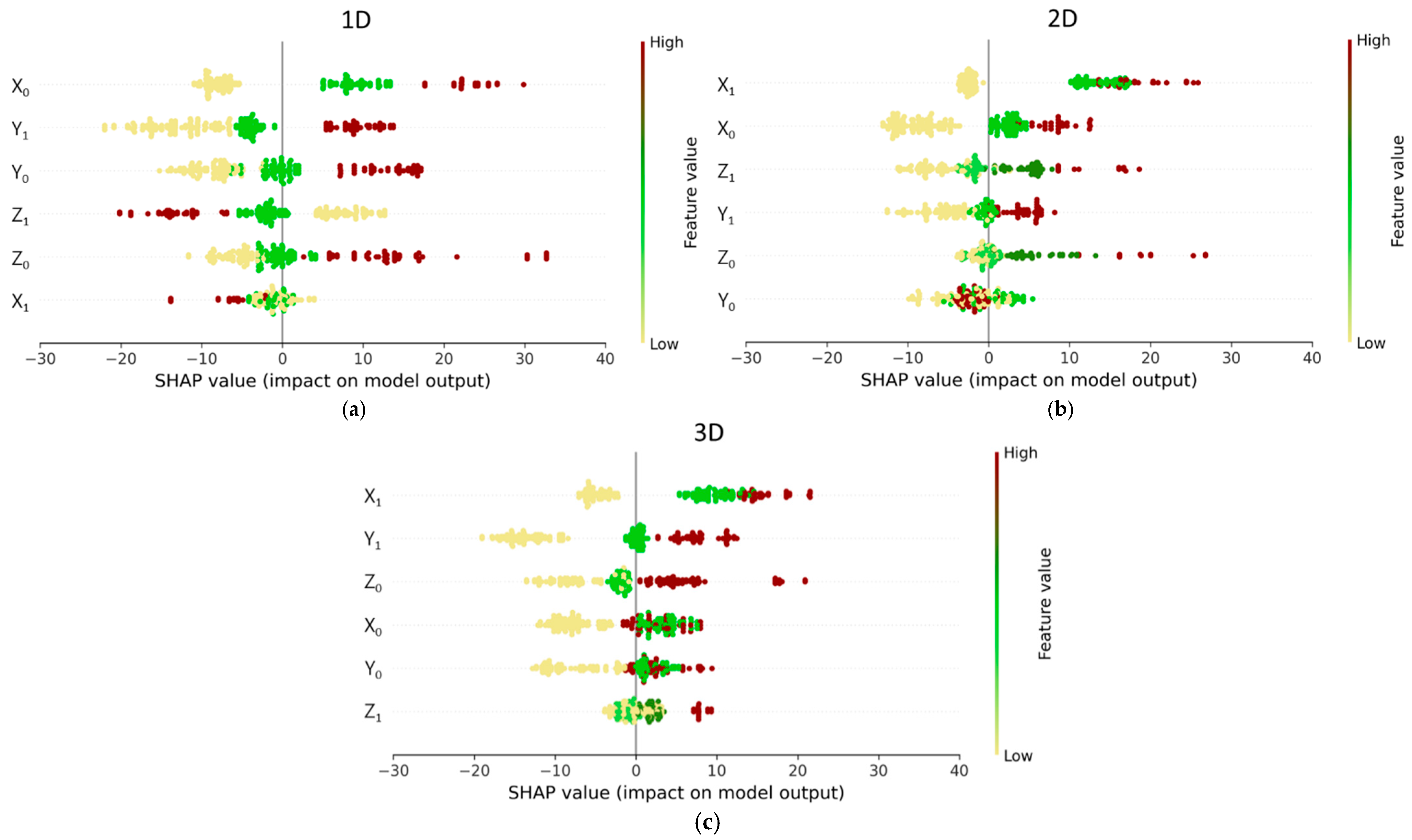 Figure 6 presents the SHAP plots of the SVM model (training data 60%) for power prediction of 1D, 2D, and 3D movements.
