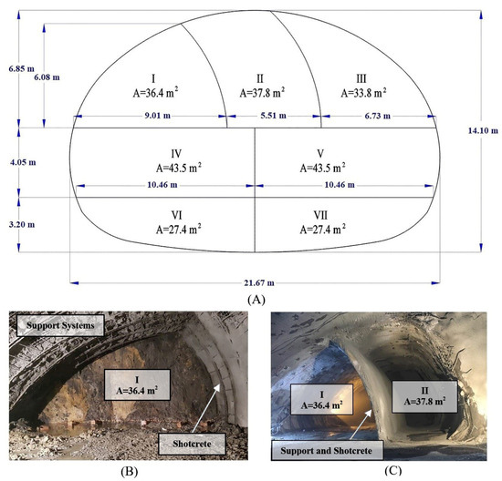 (A) Schematic diagram of the seven distinct sections and sequential excavation phases on the tunnel face. (B) Photograph of the initial excavation (Section I). (C) Photograph showing the progress after initiating Section II.