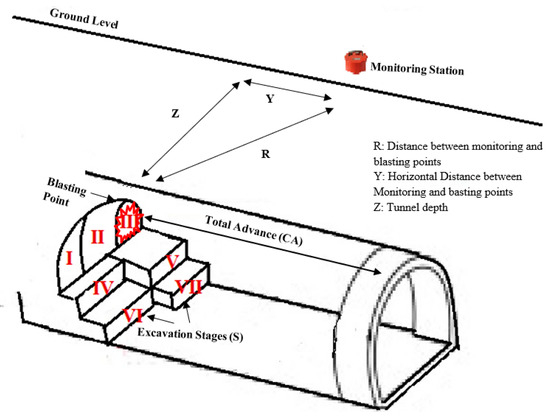The spatial relationships between blasting sources and monitoring stations are crucial. As illustrated in Figure 5, vibration waves travel to the surface through the shortest path (parameter Z) and also propagate as surface waves along the horizontal distance (parameter Y). The blasting stages (parameter S) proved significant as they determine the direction and orientation of each shot relative to the monitoring stations.