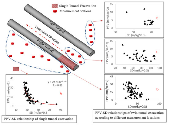 PPV-SD relationships for different monitoring station groups: (A) Single-tunnel excavation, (B) Stations ahead of left tunnel, (C) Stations behind right tunnel, (D) Stations between tunnels.