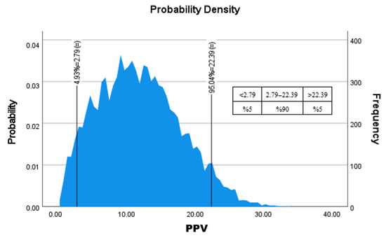 While the deterministic model provides valuable insights, its point estimates cannot capture inherent uncertainties. To address this, the multi-parameter regression model (Equation (2)) was integrated into a Monte Carlo Simulation (MCS) framework implemented in @RISK software. This approach propagates input parameter uncertainties to generate a full probability distribution of PPV, enabling quantitative risk assessment.