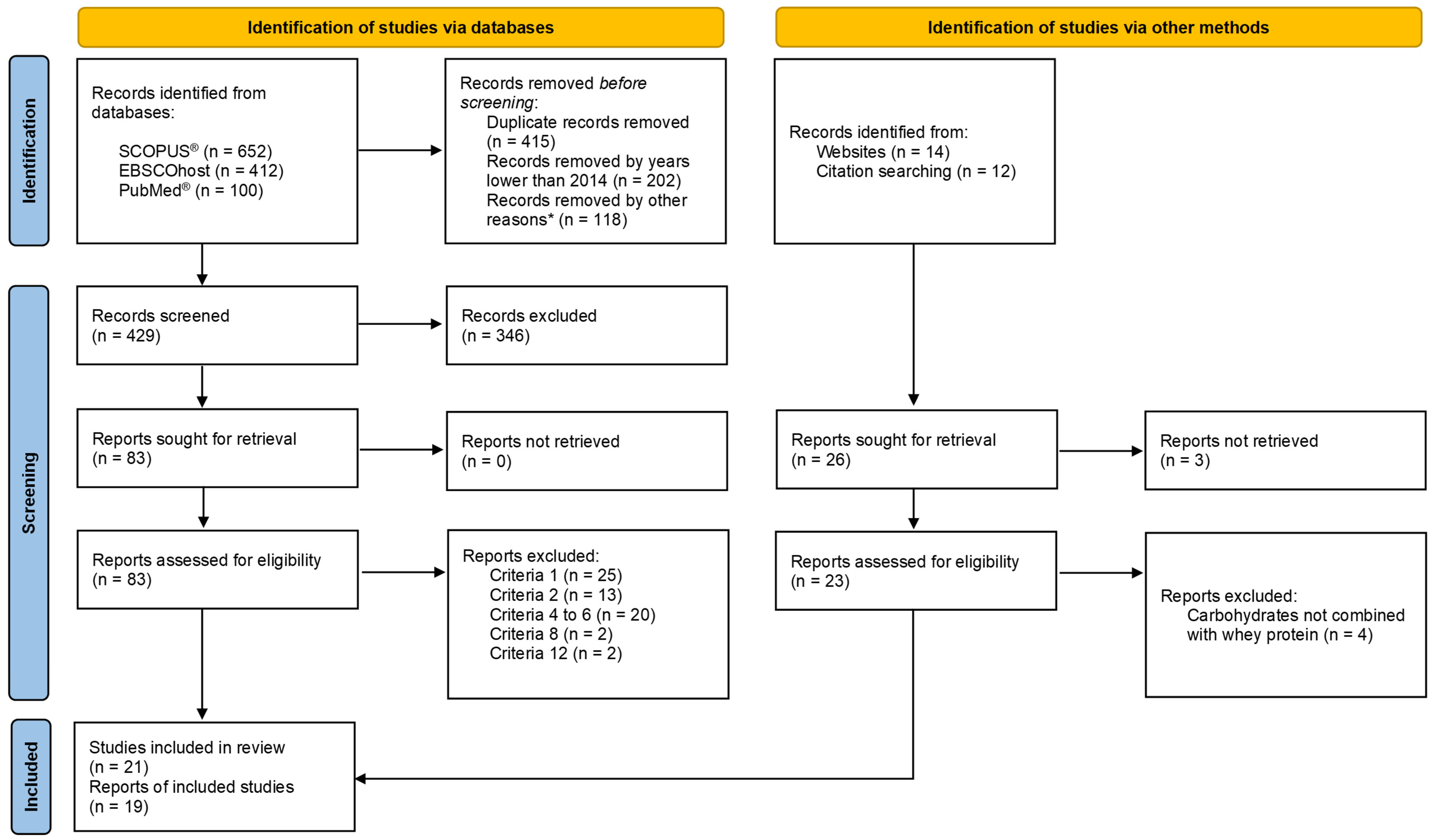 | PubMed® | ((whey[Title/Abstract]) OR (whey proteins[Title/Abstract])) AND ((carbohydrates[Title/Abstract]) OR (glucose[Title/Abstract]) OR (sugar[Title/Abstract]) OR (maltodextrin[Title/Abstract])) AND ((health benefits[Title/Abstract])) |
