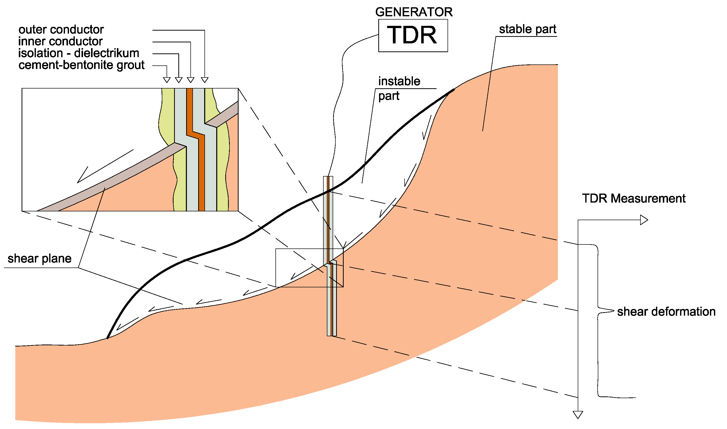 8]. The principle of TDR is based on an electrical signal sent through a coaxial cable. Shear movements deform the cable, creating a peak in the cable signature, and the depth can be inferred from the signal. Laboratory tests of TDR for detecting shear processes were performed by Baek et al. and Blackburn and Dowding [