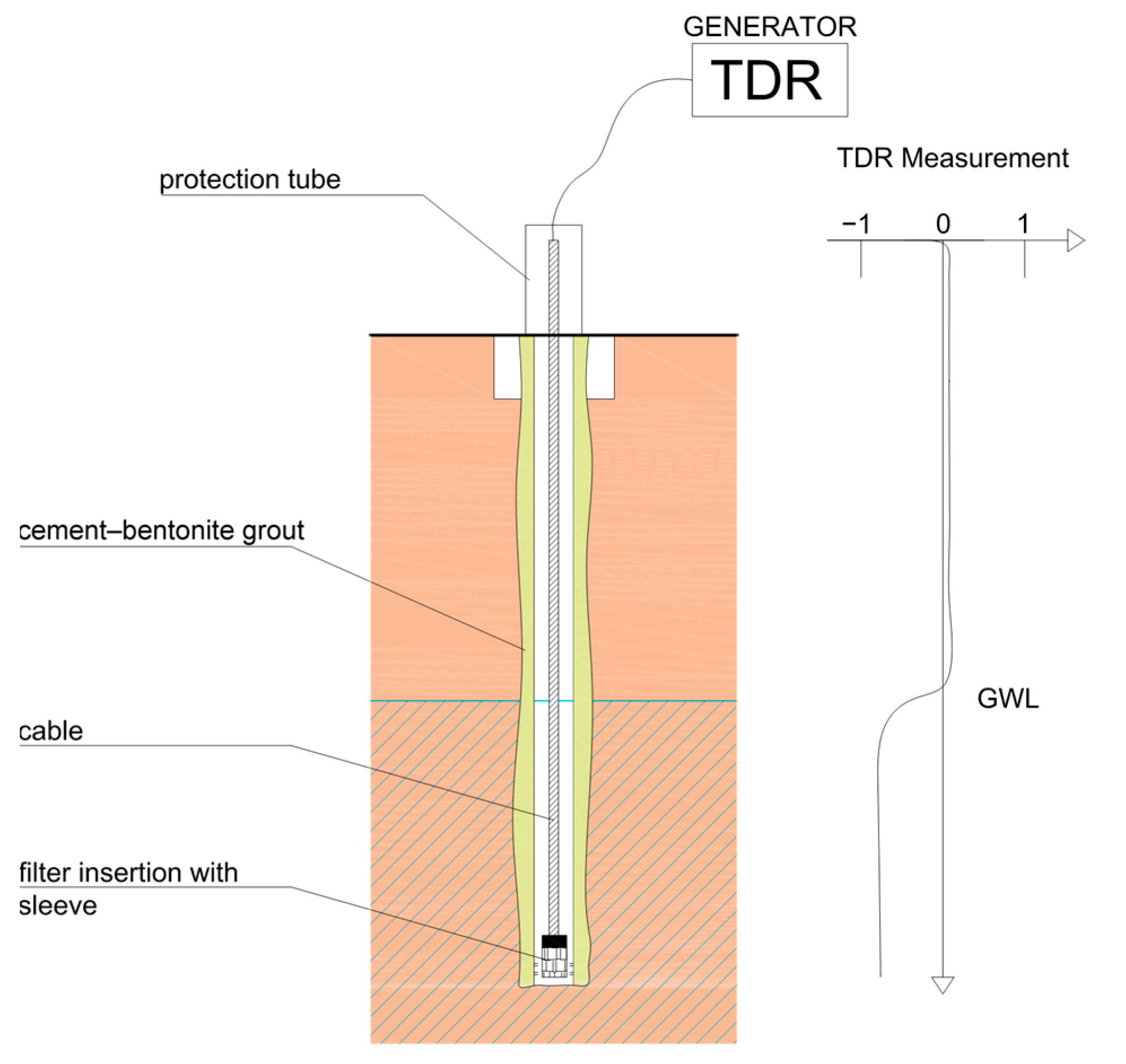 In principle, the device acts as an open piezometer for monitoring the groundwater level. It consists of the borehole in which the casing is embedded. The perforated filter tube covered with the geotextile filled with sand or fine gravel is attached at the bottom of the cable. The hollow coaxial cable with the required length is then inserted into the casing. The gap between the borehole wall and the casing is filled with a cement–bentonite grout [