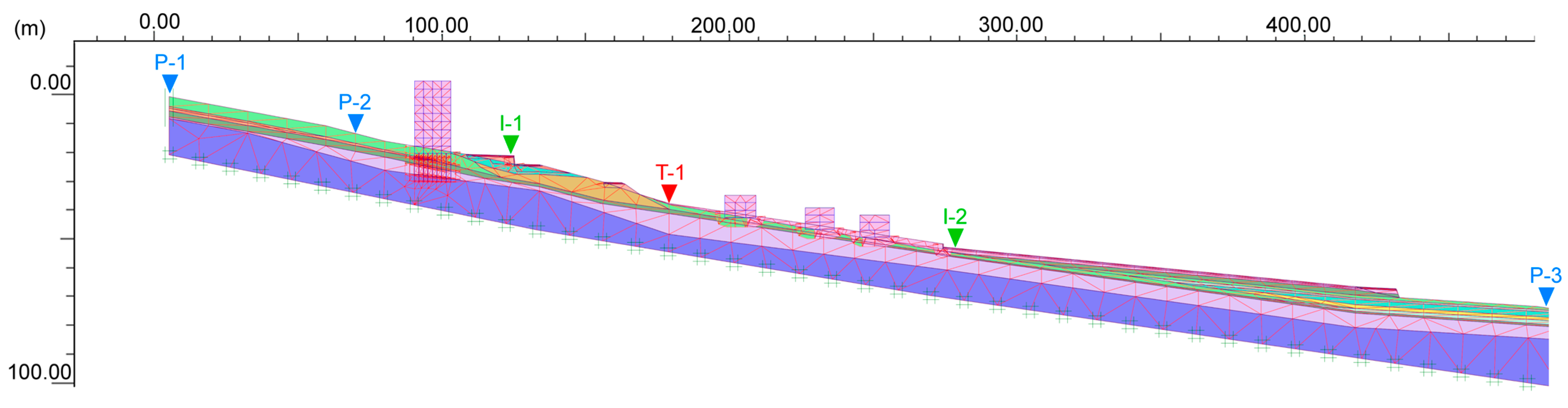 The factor of safety was calculated for the original state of the slope without the influence of anthropogenic activity. The scheme of the numerical model according to the monitoring profile (
