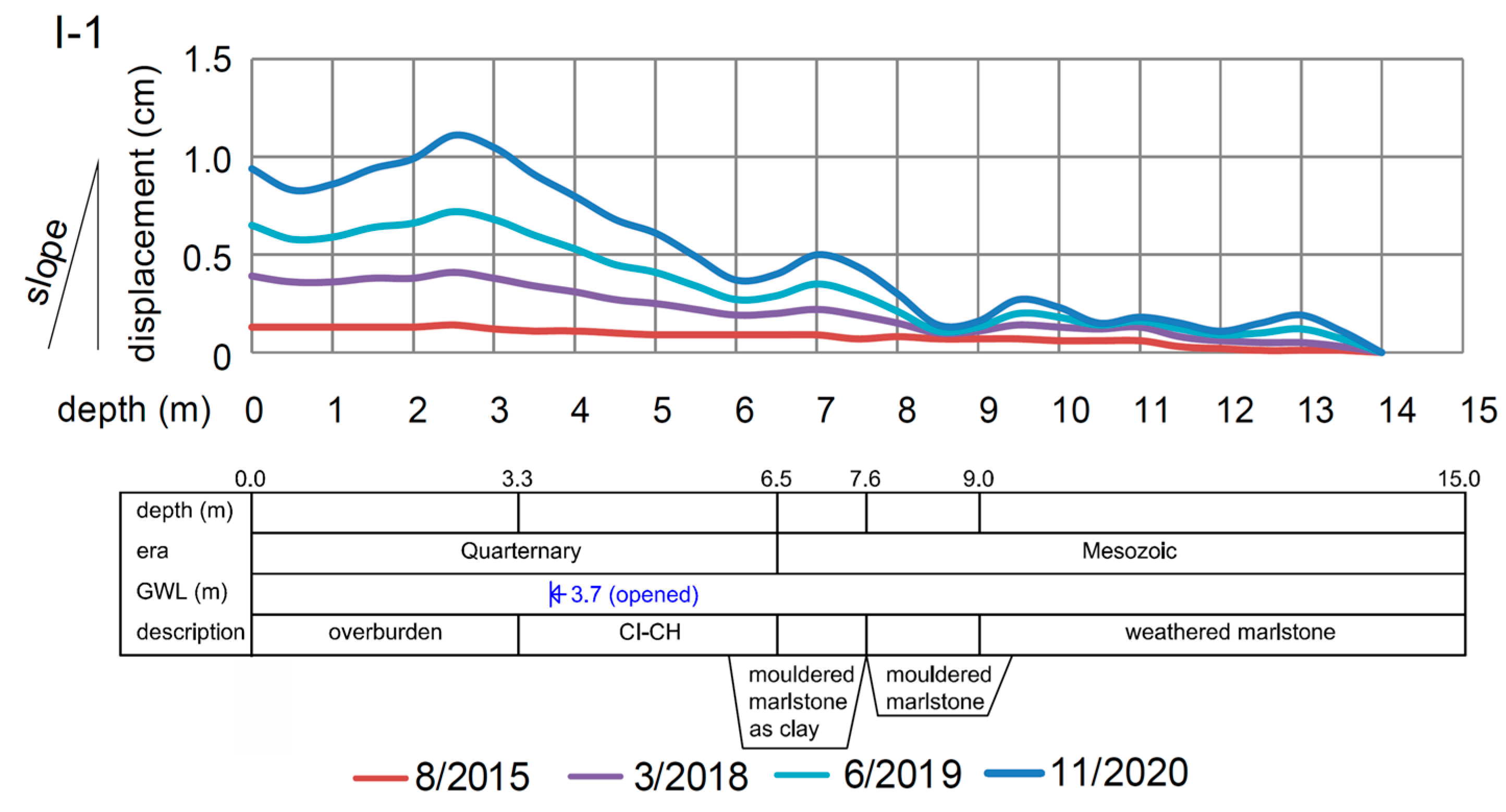 Groundwater flows from higher levels down the slope, and the amount of water depends on the seasonal change in moisture content in the massif. Groundwater was observed in the mouldered marlstone or fine sediments at a depth of 3.7 to 7.2 m. The water rose up to a level of 5.9 to 6.1 m under the terrain 24 h after initial observation. The groundwater has a tense character with uplift of 1.0 to 1.5 m after drilling in piezometers P-3 and P-2, respectively.