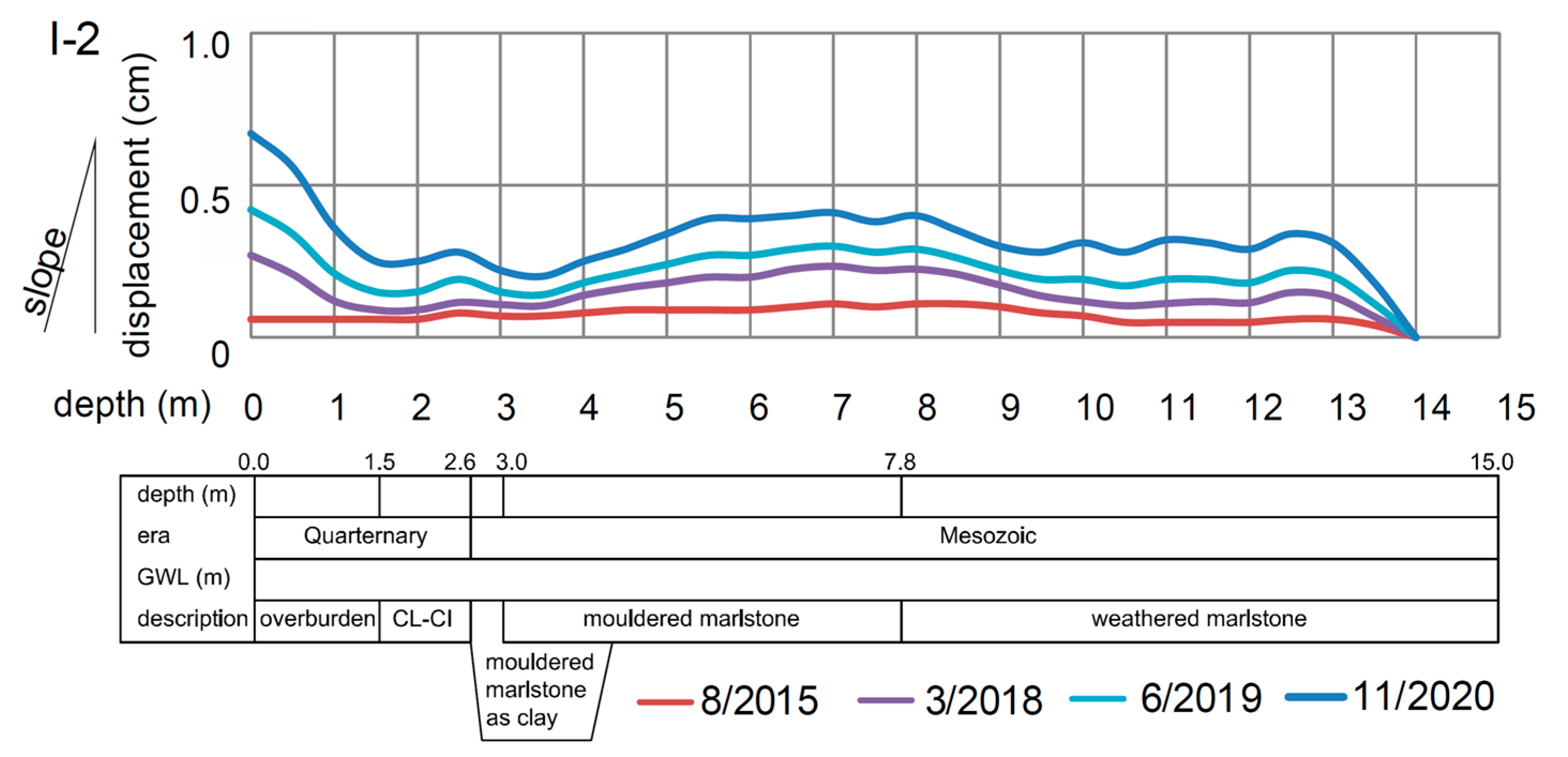 Traditional inclinometers in boreholes I-1 to I-2 using a digital vertical inclinometer;