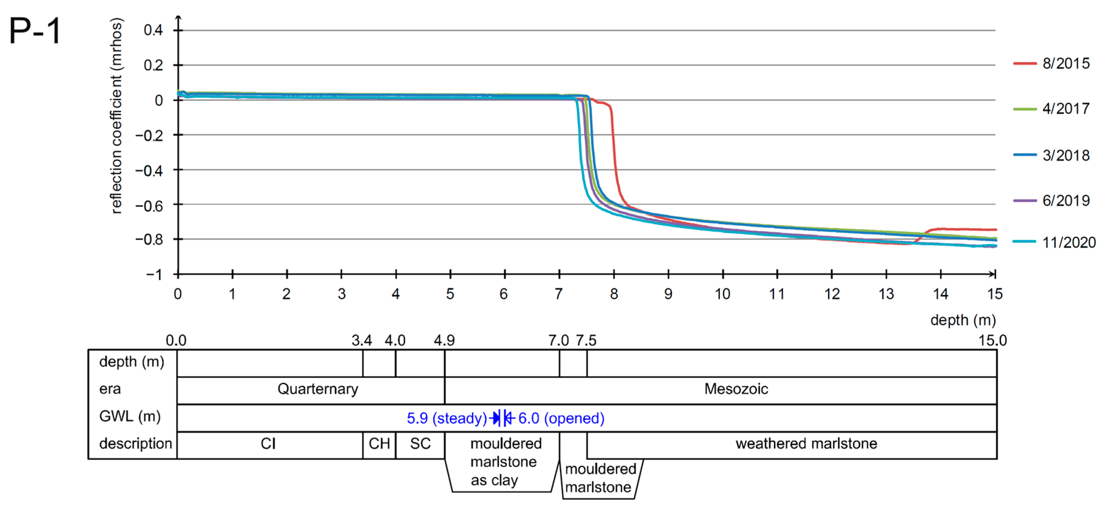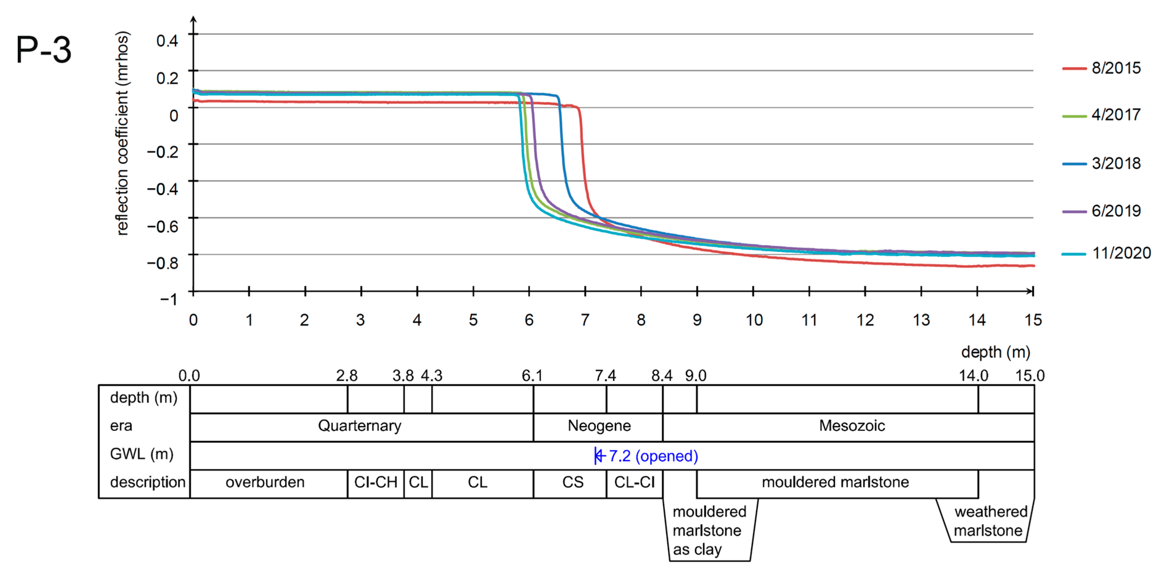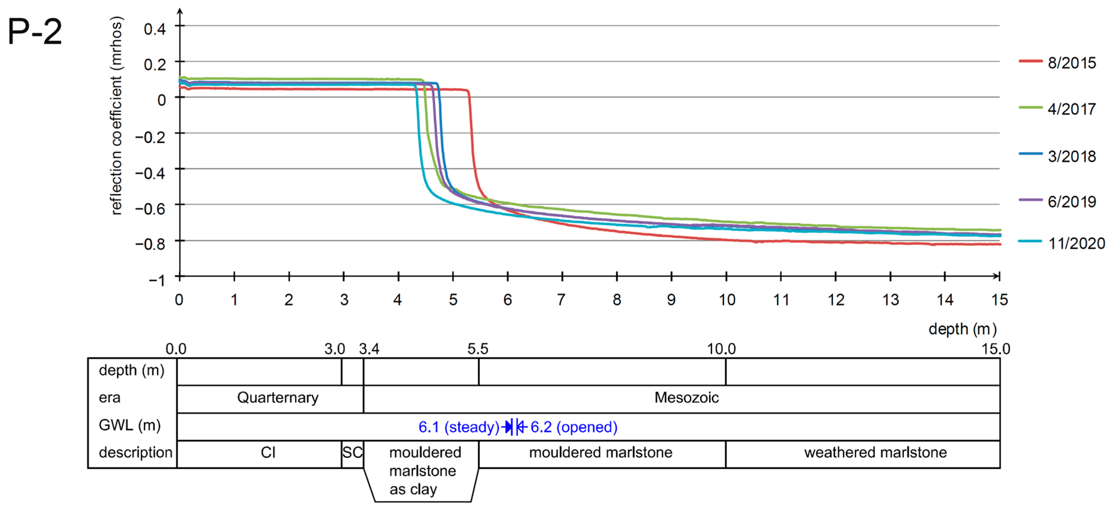 The observation of the response offers two main curve shapes. If the impulse reaches the groundwater head, the reflection coefficient gets close to the zero value, and after passing below the water, the reflection coefficient reaches negative values close to the value of −0.6. This phenomenon is based on the physical principle where the water has a higher permittivity than air. The dielectric constant of water is 81, while that of the air is only around 1.0. The change in pore pressure Δ