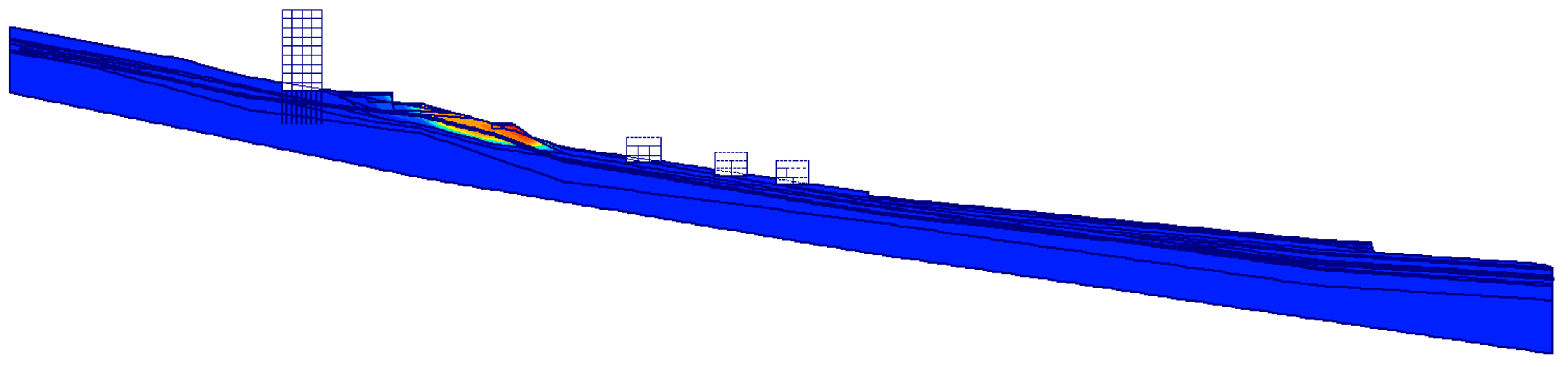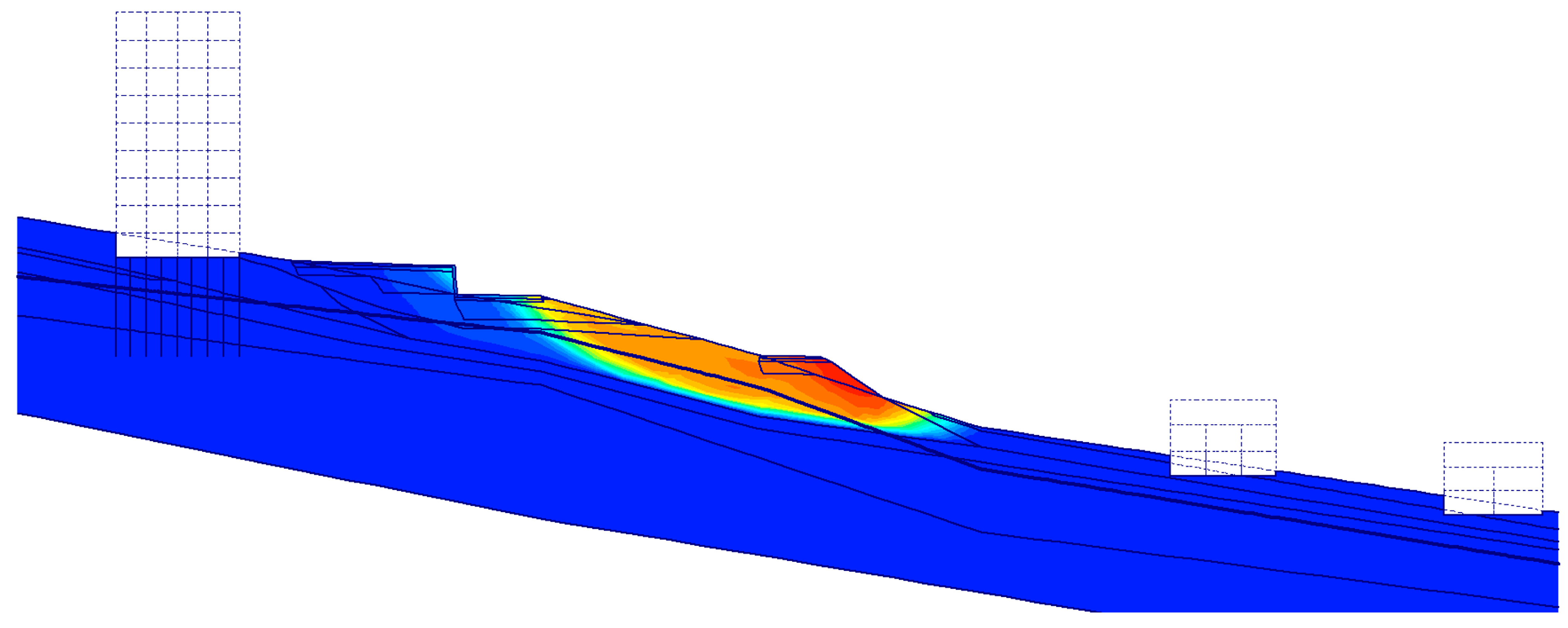 Before the calculation of the stability, an initial phase considering the actual state of the slope with the buildings and the pavements should be performed. This is performed through the gravity loading procedure instead of the usual K0 procedure. During the K0 procedure, the solver calculates the earth pressure that leads to the out-of-balance forces when the terrain or groundwater head is inclined. The initial state of our problem represents an inclined slope, so this procedure is unacceptable. When using the gravity loading procedure, the calculated forces are always balanced and correspond with the real state when no strains are allowed for the initial stage.