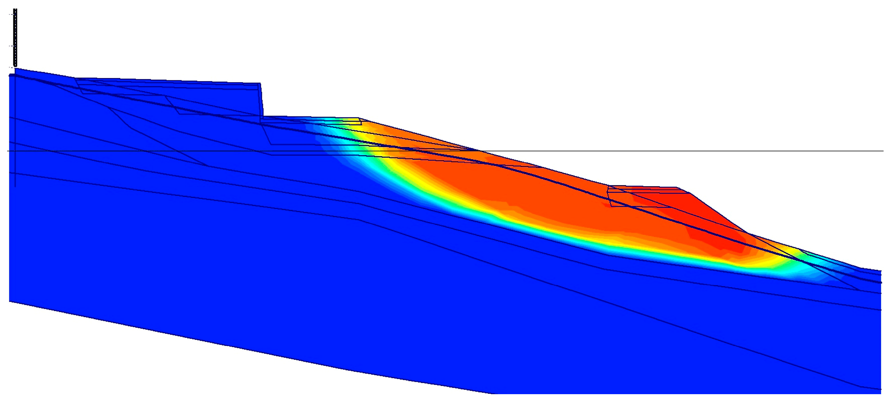 Calculation was performed in the software Plaxis 2D 8.5 using the Finite Element Method (FEM) with 15-noded elements. The Mohr–Coulomb material model was selected. The investigation of slope stability is based on the determination of the safety factor
