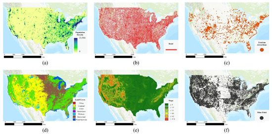 Input datasets for the United States. (a) Population density, (b) road network, (c) tourism attraction, (d) land cover, (e) slope, and (f) mine locations.