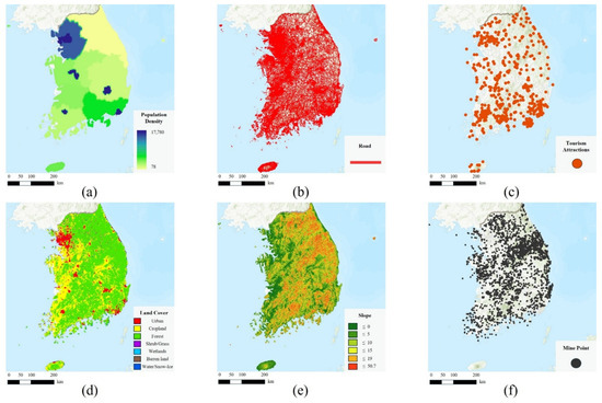 Input datasets for South Korea. (a) Population density, (b) road network, (c) tourism attraction, (d) land cover, (e) slope, and (f) mine locations.