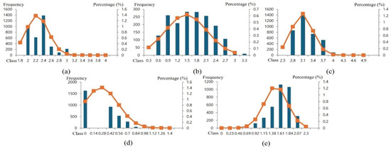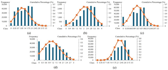 Frequency distributions of log-transformed variables and fitted normal probability curves for South Korea. (a) Population density, (b) urban ratio, (c) road accessibility, (d) tourist attractions, and (e) slope.