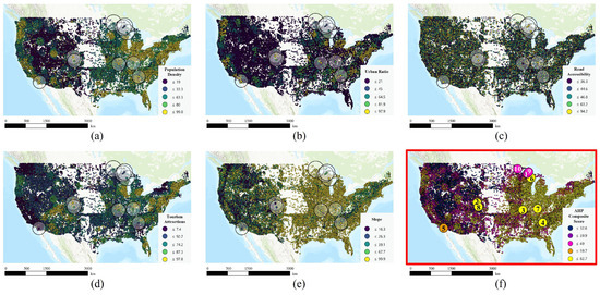 Normalized indicator scores and overall composite score for the United States. (a) Population density, (b) urban ratio, (c) road accessibility, (d) tourist attractions, (e) slope, and (f) overall composite score map and locations of the ten selected restored mine sites (1–10).