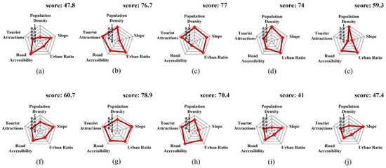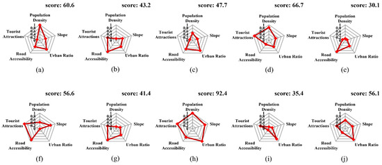 Indicator score radar charts for representative reclaimed mines in South Korea. (a) Pocheon art valley, (b) Hamtae anthracite mine, (c) Danyang limestone mine, (d) Jeil mine, (e) Samtan art mine, (f) Eunsung colliery, (g) Jangseong colliery, (h) Siheung mine, (i) Ssangyong Mukho district 3, and (j) Hwalok cave.