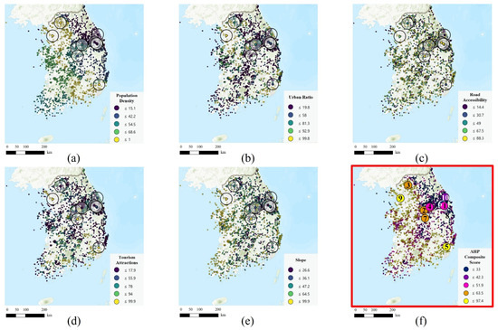 Normalized indicator scores and overall composite score for South Korea. (a) Population density, (b) urban ratio, (c) road accessibility, (d) tourist attractions, (e) slope, and (f) overall composite score map and locations of the ten selected restored mine sites (1–10).