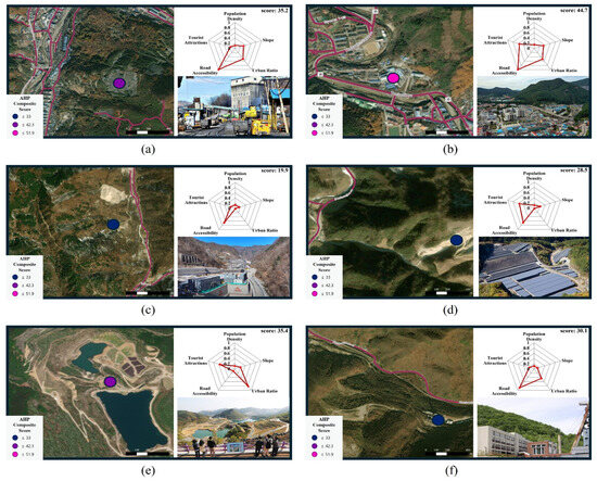 AHP-based suitability and site imagery for four selected mines: (a) Dogye mine [32], (b) Jangseong mine [33], (c) Sangdong mine [34], (d) open-pit mine in hajeon-myeon [35], (e) Mureung Byeolyucheonji [36], and (f) Samtan Art Mine [37].