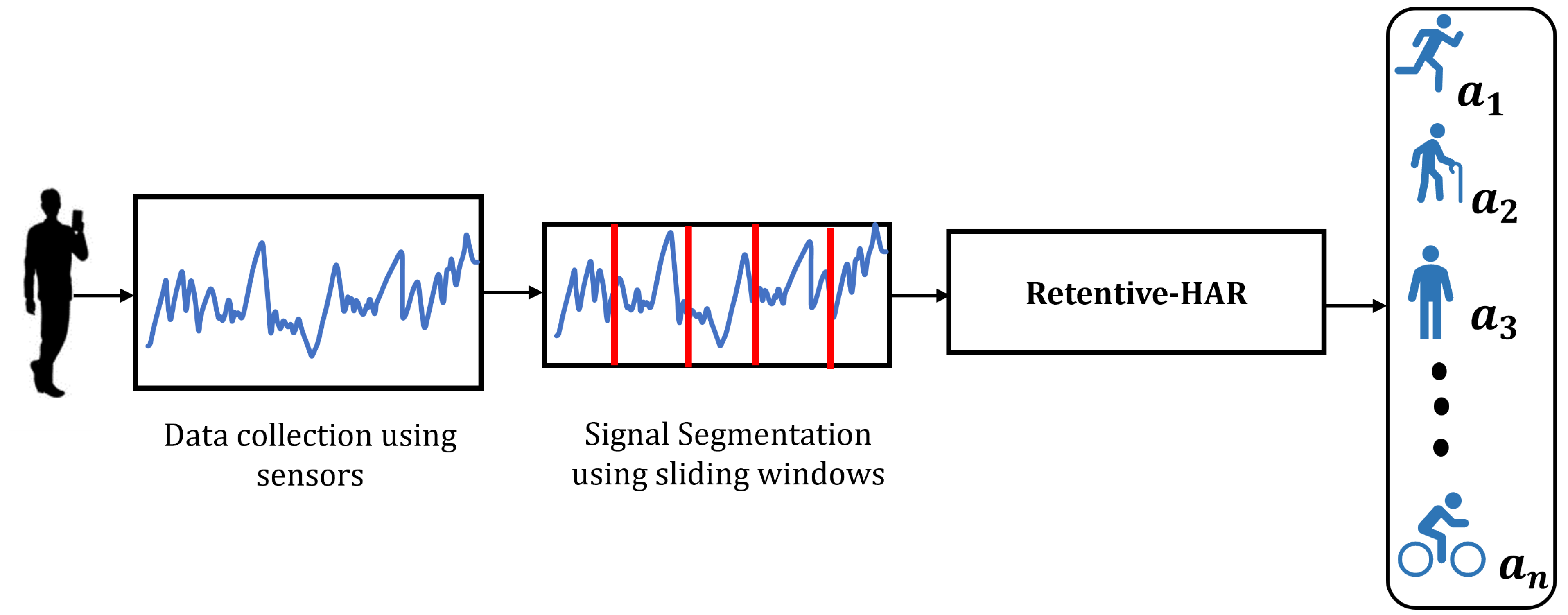 The sensor data are then segmented using the sliding window segmentation. A fixed-size window with a degree of overlap is used to segment the continuous signal stream into smaller, temporally consistent fragments. This segmentation is essential for preserving the sequential nature of the data while facilitating uniform input dimensions for subsequent model processing. Thereafter, the segmented signals are then passed into the proposed Retentive-HAR model. This model is designed to effectively capture both local dependencies and long-range temporal patterns, enabling robust classification of human activities. The final output of the model is a predicted activity label , which corresponds to a specific class such as walking, running, standing, sitting, or cycling.