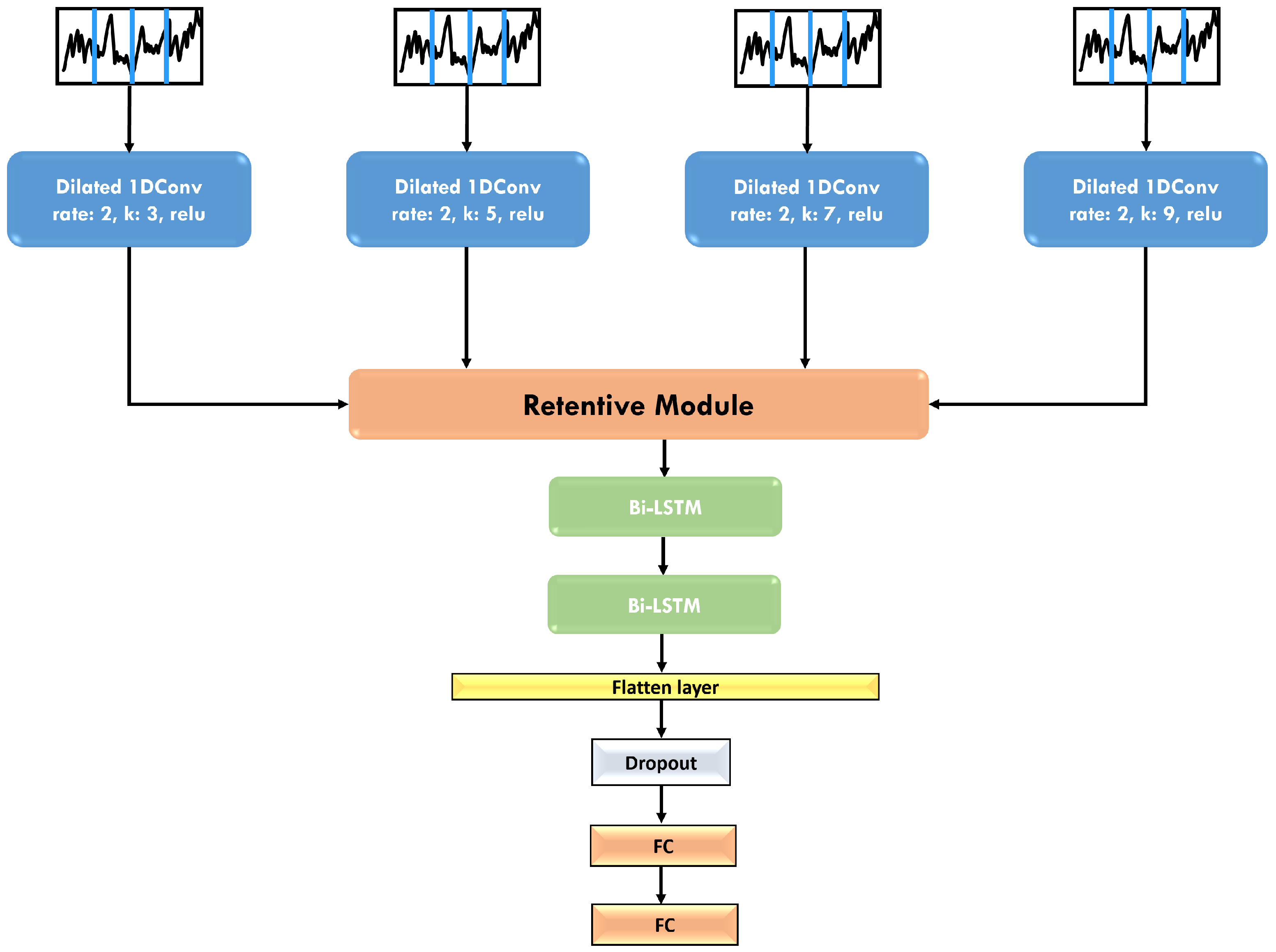 Retentive-HAR model aims to capture both local and temporal dependencies through dilated convolutions, feature concatenation, transposition, and Bi-LSTM layers. The workflow of the model is presented in