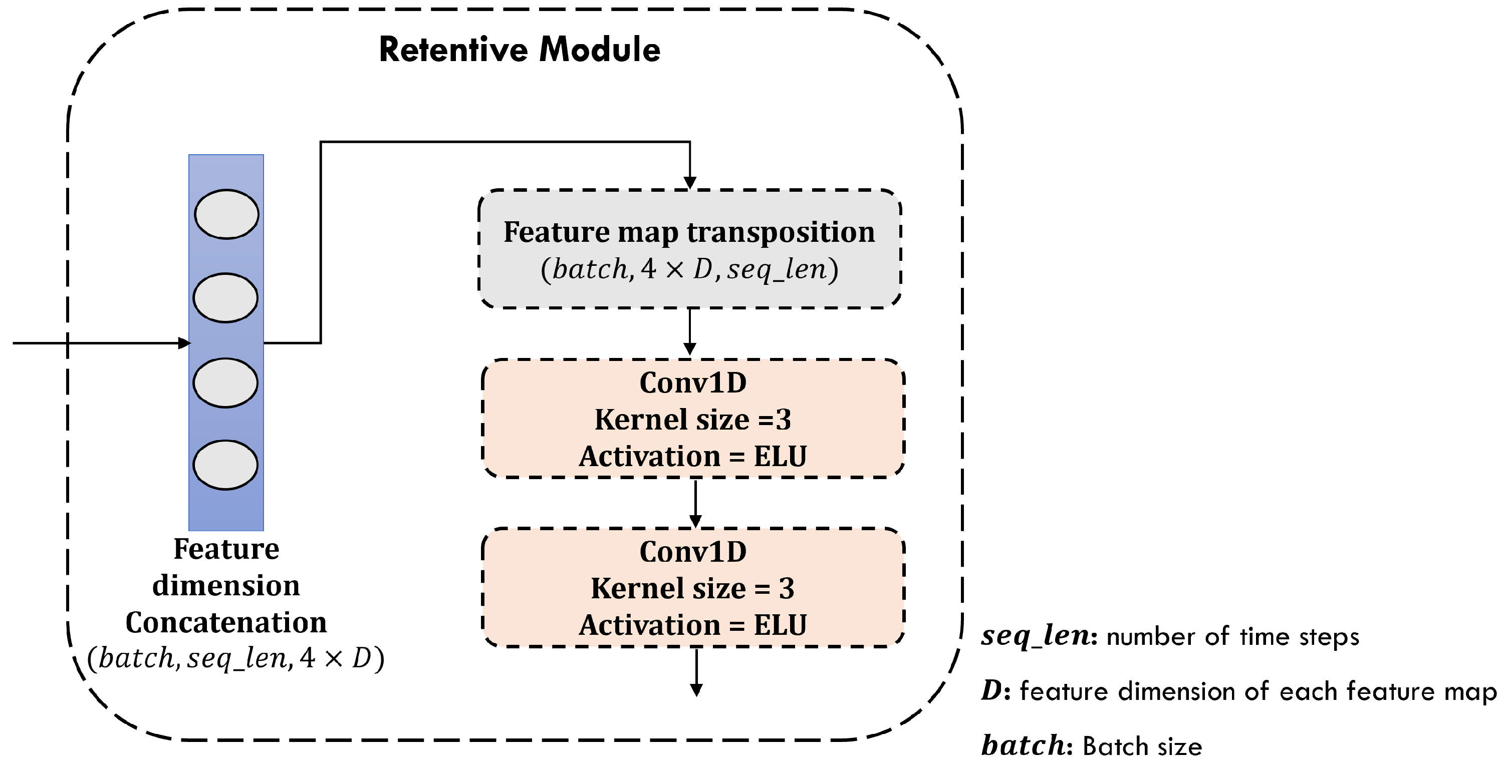 To capture dependencies across feature maps, the ELU (Exponential Linear Unit) activation function is used with both Conv1D layers in the Retentive module. This process enables the model to capture short to mid-range temporal dependencies across time steps by convolving over the transposed time dimension.