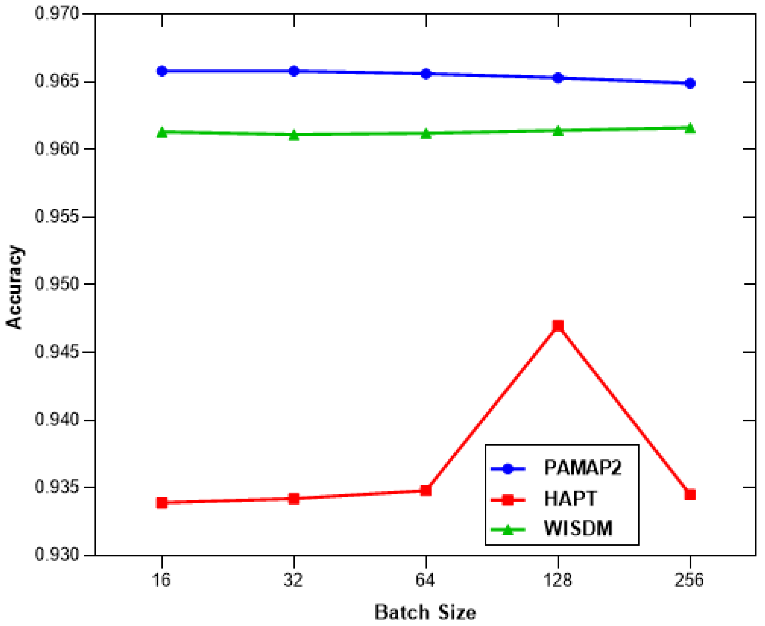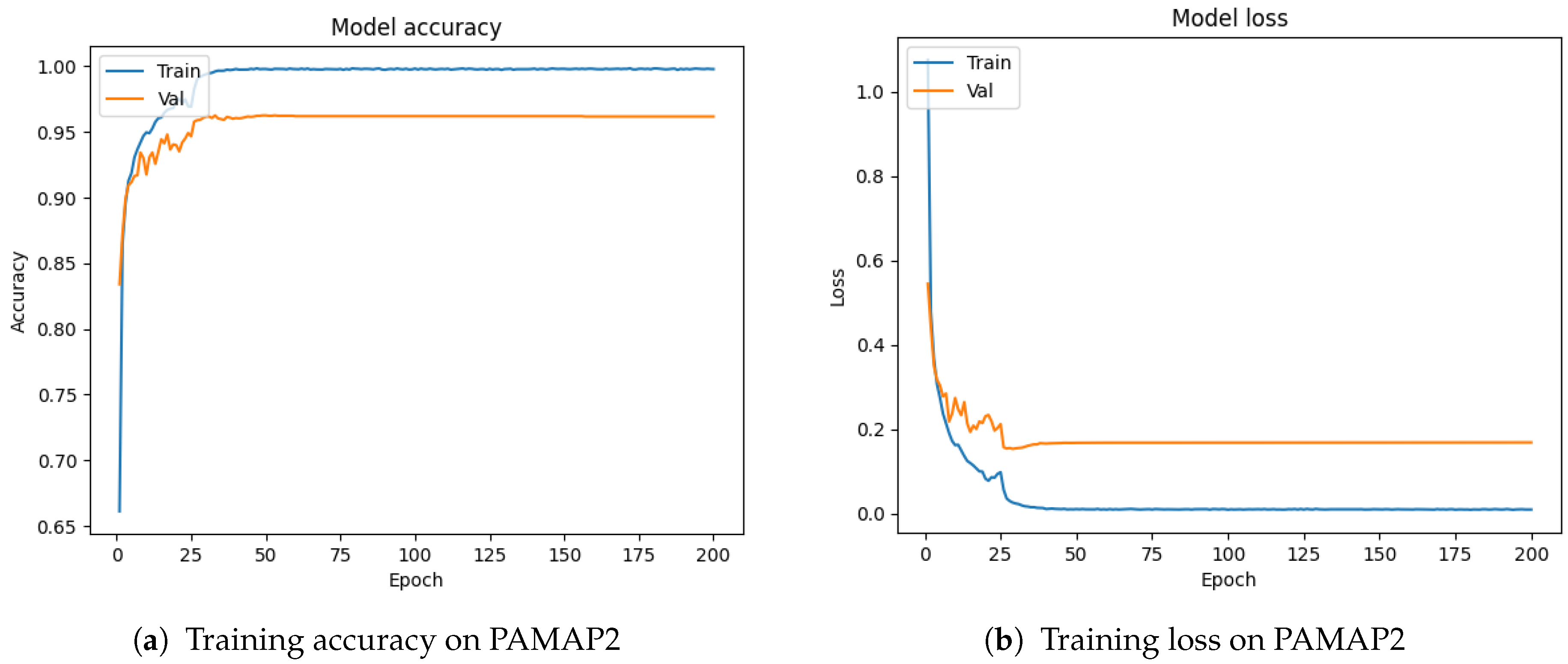 Batch sizes were adjusted according to the dataset to balance performance and memory usage: 128 for PAMAP2 and HAPT and 256 for WISDM. Kernel sizes of 3, 5, 7, and 9 were used in the initial convolution layers to capture multi-scale temporal features, while a kernel size of 3 was fixed for the Retentive module. The dilation rate was set to two to expand the receptive field efficiently without increasing the model’s parameter count.