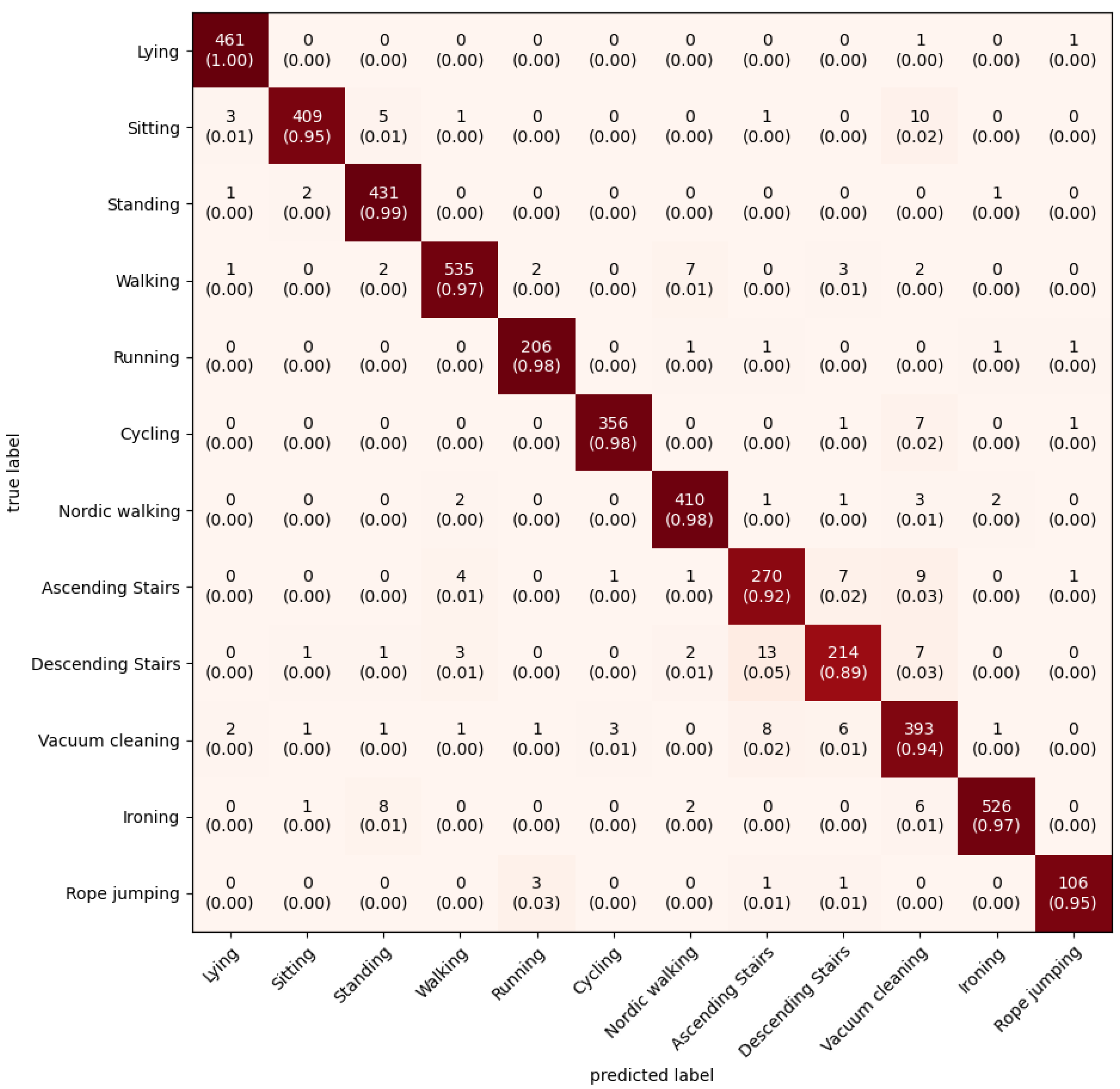 On the PAMAP2 dataset, the model returns 96.40%. The confusion matrix is presented in