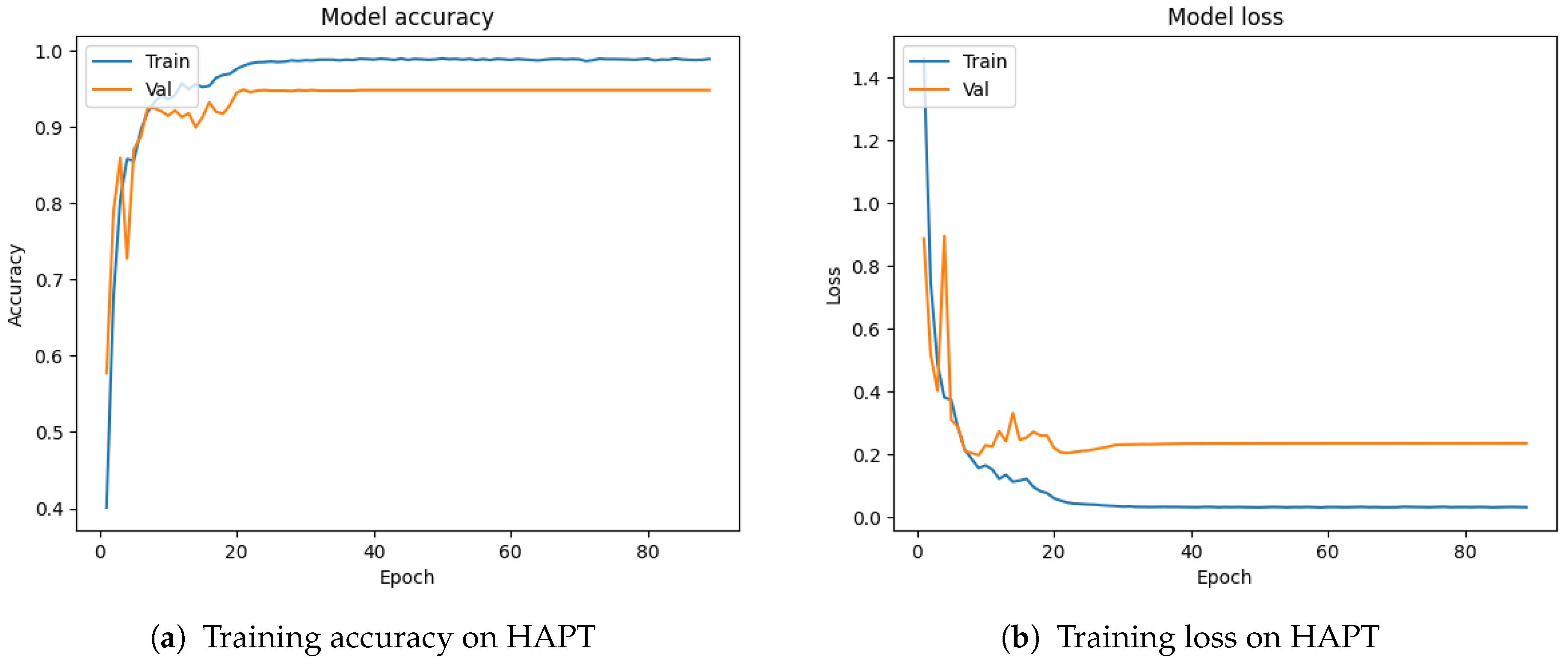 On the HAPT dataset, the model achieved a recognition accuracy of 94.70%. The model training and loss are presented in