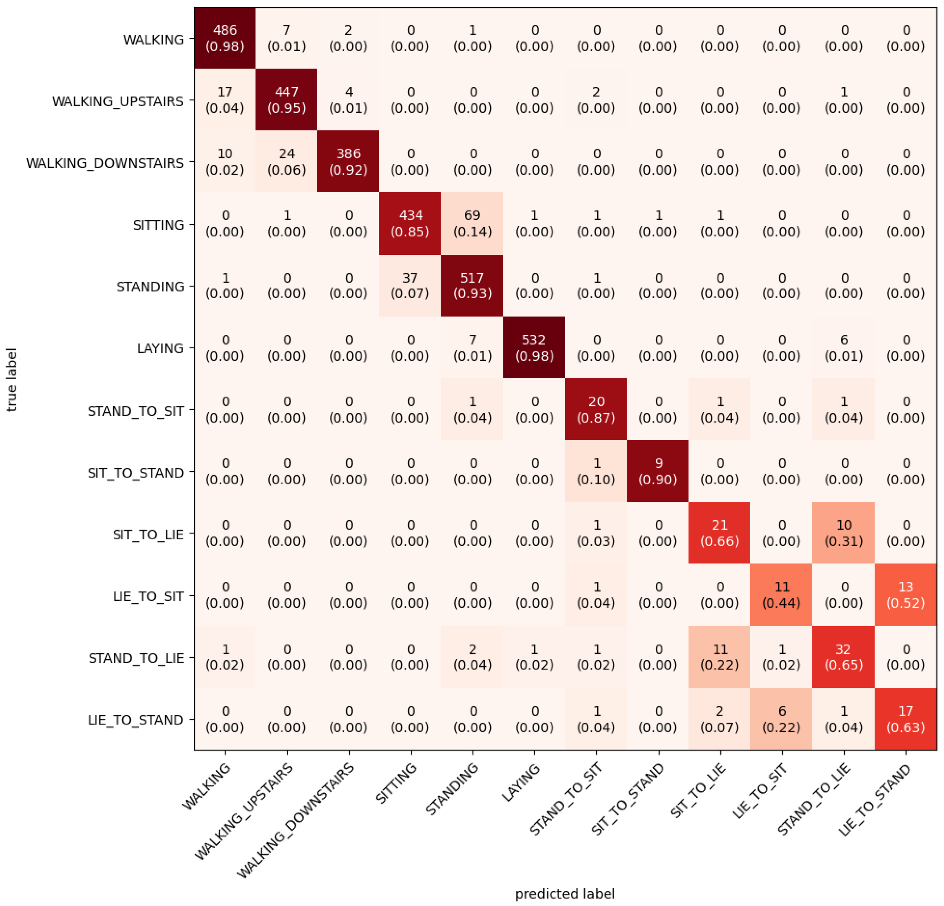 As shown in the confusion matrix, the model achieved precision rates above 0.90 for Walking (98%), Walking Upstairs (95%), Walking Downstairs (92%), Standing (93%), and Laying (98%). These results highlight the model’s ability to accurately recognize distinct movement patterns that exhibit consistent and repetitive temporal signals. In particular, the model effectively distinguishes between walking variants, showing minimal confusion among Walking, Walking Upstairs, and Walking Downstairs, which are often difficult to separate due to their shared gait structure. For static postures, the model also performs well. Laying is correctly classified in 98% of cases, while Sitting and Standing achieve 85% and 93% accuracy, respectively. Misclassifications between Sitting and Laying are relatively low, suggesting that the model can effectively distinguish between subtle differences in sensor signals that arise from torso orientation and movement levels. However, the most notable performance challenge lies in the classification of transitional activities. For instance, Sit-to-Lie is frequently misclassified as Lie-to-Sit and Lie-to-Stand, and Stand-to-Lie is misidentified as Sit-to-Lie or Lie-to-Sit.