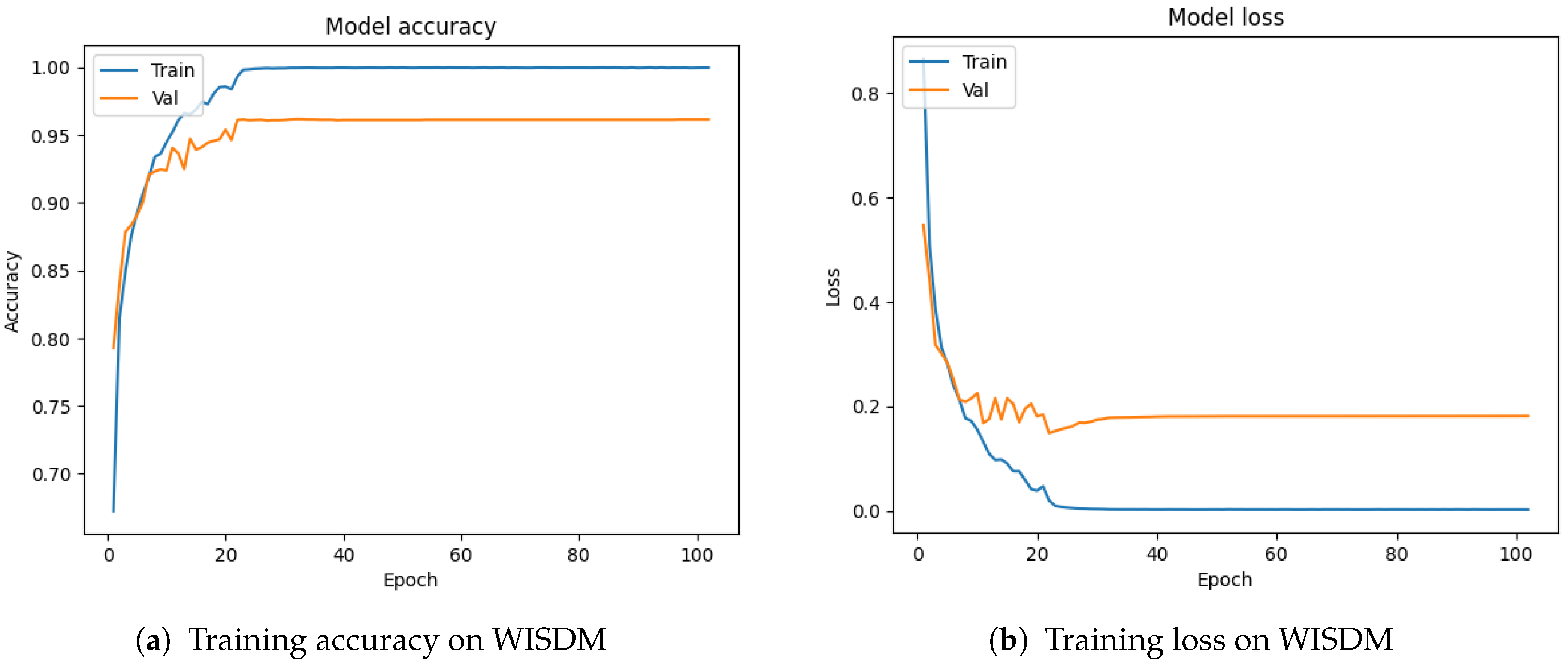 The proposed Retentive-HAR model achieved a recognition accuracy of 96.16% on the WISDM dataset. The model training and loss plot is presented in