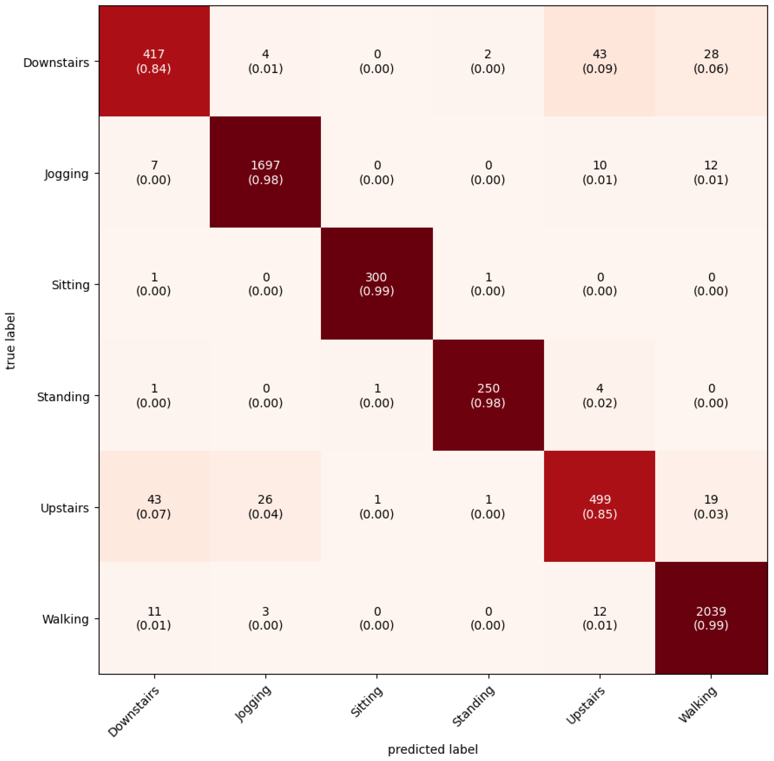 Figure 11. As shown, the confusion matrix showcases strong classification performance across all six activity classes. The model demonstrates excellent predictive accuracy for Walking (99%), Sitting (99%), and Jogging (98%), highlighting its ability to learn both static and dynamic motion patterns effectively. Standing and Upstairs are also recognized with high accuracy (96% and 85%, respectively), although minor confusion exists between Upstairs and Downstairs, which is expected given their similar movement dynamics. The most notable misclassification occurs within the Downstairs activity, where some samples are incorrectly predicted as Upstairs (9%) and Walking (6%). Nonetheless, the model retains a high degree of class separability, reflecting the effectiveness of the Retentive Module in capturing temporal dependencies.