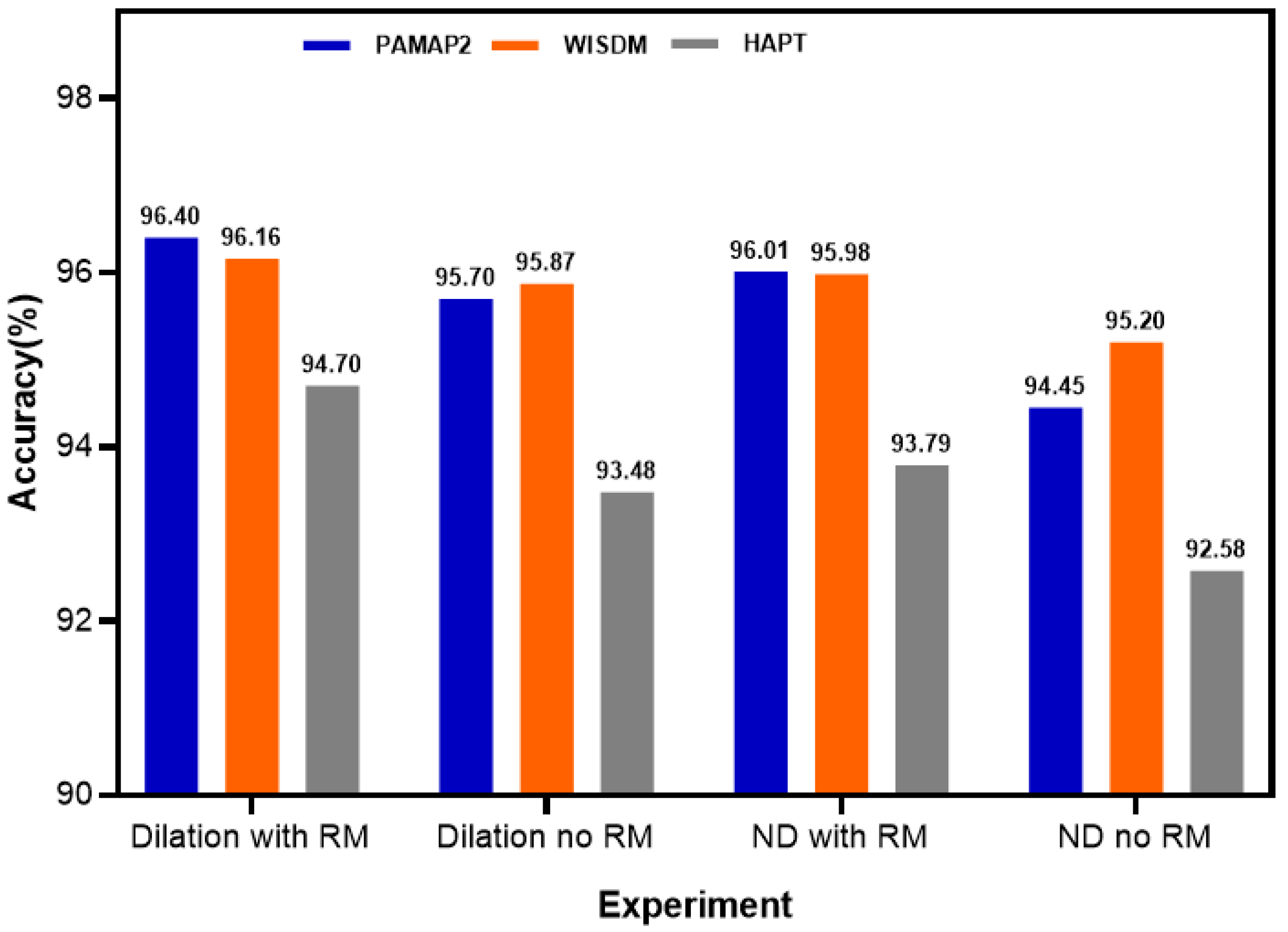 Similarly, the No Dilation with RM configuration still achieved competitive performance (96.01% on PAMAP2, 95.98% on WISDM, and 93.79% on HAPT), demonstrating that the Retentive module alone significantly contributes to learning discriminative representations. However, the performance is marginally lower than the full model, highlighting the complementary roles of dilated convolutions and the Retentive module. The lowest performance was observed in the No Dilation, No RM configuration, where both components were removed. Accuracy dropped to 92.58% on HAPT, 94.45% on PAMAP2, and 95.20% on WISDM, reinforcing the importance of both dilation and the Retentive module in achieving optimal model performance.