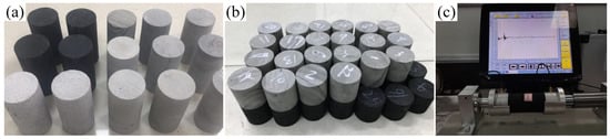 Standard samples. (a) Pure coal and rock samples; (b) coal–rock combined samples; (c) P-wave testing of the samples.