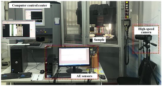 The uniaxial loading testing system employed an electrohydraulic servo universal testing machine (MTS C64.106/10; MTS Industrial Systems (China) Co., Ltd., Shenzhen, China). This system can facilitate mechanical tests, such as compression and shear, on coal–rock specimens. The testing machine employs an electrohydraulic servo control with a maximum test force of 1000 kN, a load measurement accuracy of ±0.5%, and a sampling frequency of 1000 Hz. Displacement measurement accuracy is ±0.5%, and strain measurement accuracy is ±0.5%. The testing system and monitoring equipment are illustrated in Figure 3.