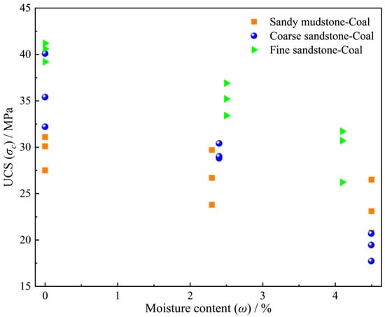 Relationship between unconfined compressive strength (UCS) and moisture content in combined coal–rock of different lithology.