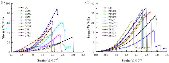Stress–strain curves of samples. (a) Pure coal and rock samples; (b) coal–rock combined samples.