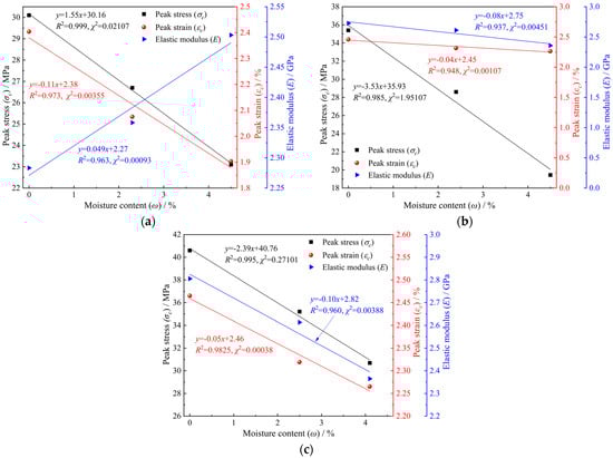 Comparison of mechanical parameters for composite specimens under different moisture content. (a) Sandy mudstone–coal composite specimen. (b) Coarse sandstone–coal composite specimen. (c) Fine sandstone–coal composite specimen.