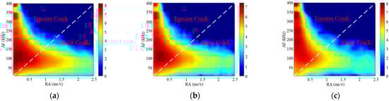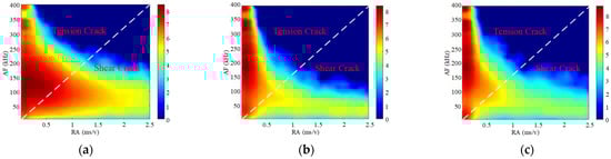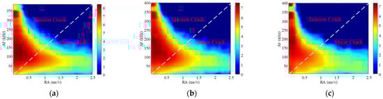 The rise in time-to-amplitude ratio (RA) and average frequency (AF) values in the AE monitoring data can be utilized to distinguish crack types within the coal rock. Here, RA (ms/v) denotes the ratio of the rise time to amplitude, while AF (kHz) represents the ratio of the impact count to the duration. Research indicates that shear fractures within coal–rock materials typically manifest as sonic emission signals with low AF and high RA values, whereas tensile fractures exhibit the opposite characteristics [24,48]. Based on the experimental AE monitoring results, density contour plots of the RA–AF relationship for coal–rock composite specimens with varying lithologies and moisture content are presented in Figure 8, Figure 9 and Figure 10. Using the 45° axis as the boundary, the density contour plots were divided into a tensile fracture zone on the left and a shear fracture zone on the right. Within these plots, the color gradient from blue to red indicates the data density ranging from sparse to dense, with deep red denoting maximum data density and deep blue indicating zero density. Data signals near the boundary line represent the mixed tension–shear crack zone within the specimen.