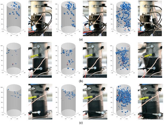 The three-dimensional spatial localization results of AE events provides direct evidence for understanding the failure mechanism of the composite specimens. During the initial loading phase (0.3σc), fracture events within the composite specimens were relatively infrequent and exhibited a random, dispersed distribution. Upon reaching 0.6σc, fracture events began to increase significantly, exhibiting pronounced spatial distribution variations attributable to differing coal–rock properties within the composite. With further loading, fracture events became increasingly concentrated and internal cracks progressively propagated toward the specimen surface, ultimately coalescing to form a dominant macroscopic fracture plane.