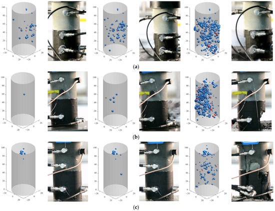 Spatial distribution of AE events in sandy mudstone–coal composite specimens with different moisture content. (a) Dry state. (b) Natural moisture content. (c) Saturated.
