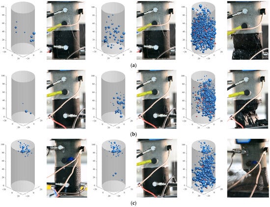 As the moisture content increased, the number of various fracture types within the composite decreased, and their distribution was concentrated toward the vertical axis. To more intuitively analyze the evolution patterns of damage-fracturing and microfracture spatial distribution across different stages before peak load is reached in water-bearing coal-rock composite specimens, the spatial development characteristics of fracture zones at locations 0.3σc, 0.6σc, and σc were investigated based on AE event localization results. The corresponding results are presented in Figure 11, Figure 12 and Figure 13, which are arranged left to right in order of increasing stress levels and include physical photographs of the specimens at each stress stage. The fracture locations within the specimen are represented by spheres, with the sphere size and color denoting the energy released during fracture initiation. Different colors are used to distinguish between the fracture types: blue indicates tensile fracture events, and red indicates shear fracture events.