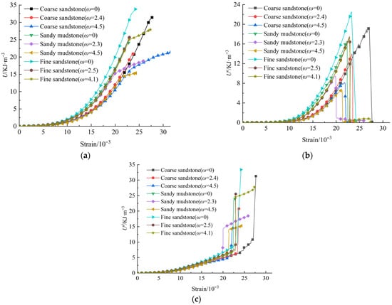 Variation curves of total energy, elastic strain energy, and dissipated energy for coal–rock composite specimens under different lithologies and moisture conditions. (a) U. (b) Ue. (c) Ud.